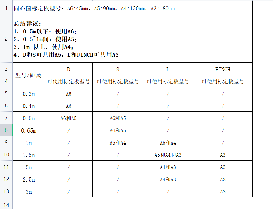 1、精度校验选择正确的同心圆标定板型号:分为A3(圆心距180mm),A4(圆心距130mm),A5(圆心距90mm),A6(圆心距45mm)
