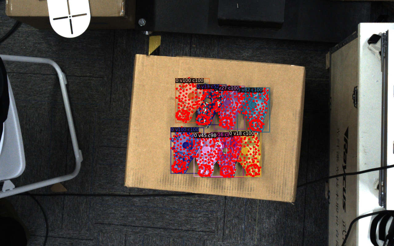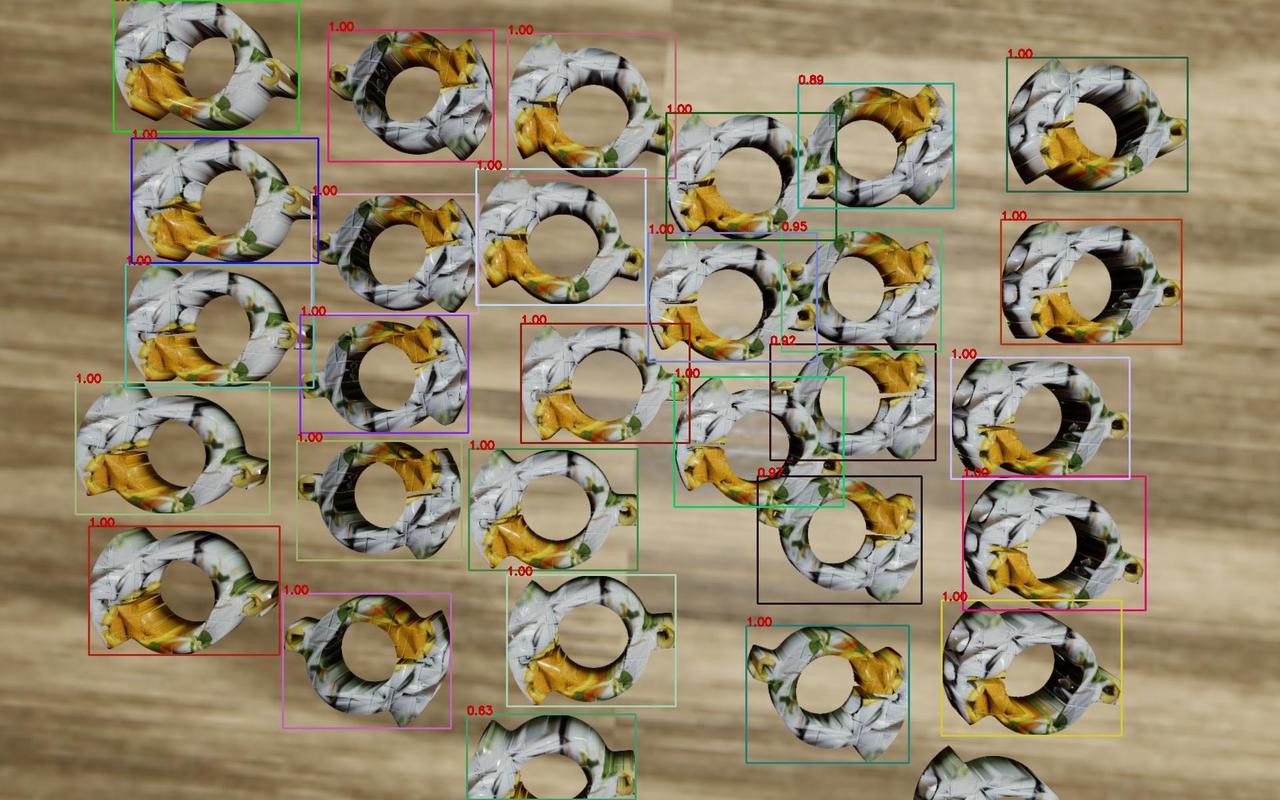 示例:面型+对称型工件本身的正反面区别较小,若开启混合无序场景数据,生成的训练数据里包含了多个姿态,模型对工件的正反面判断会出错,如下图所示。