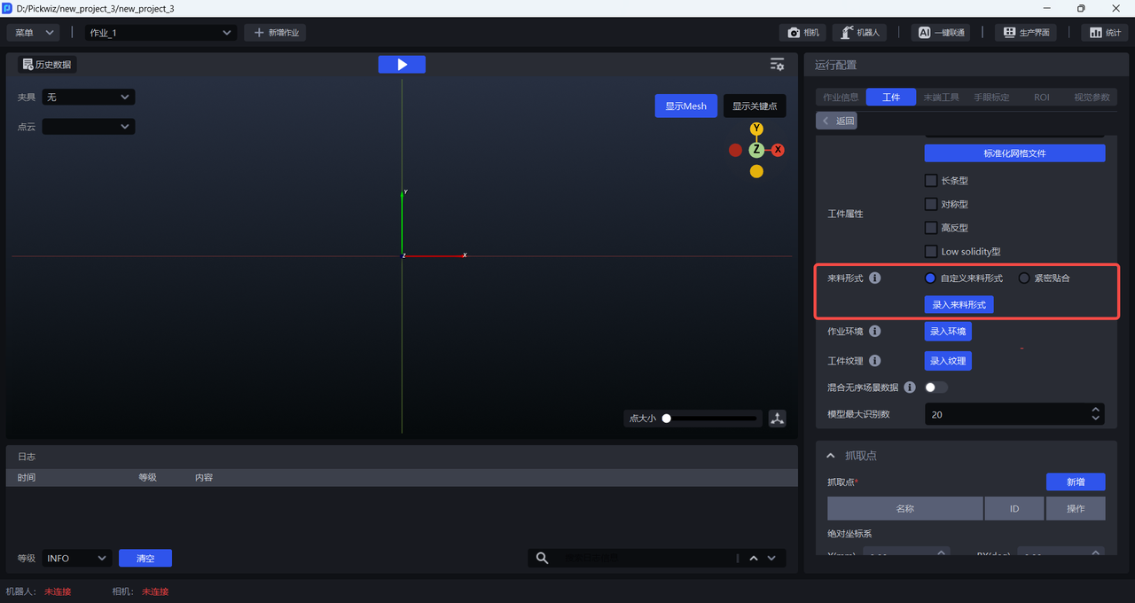 来料形式分为两种:“紧密贴合” 和 “自定义来料形式”,“紧密贴合” 适用于工件有序来料、姿态一致、间距较小的场景,“自定义来料形式” 适用于来料有序的所有场景。