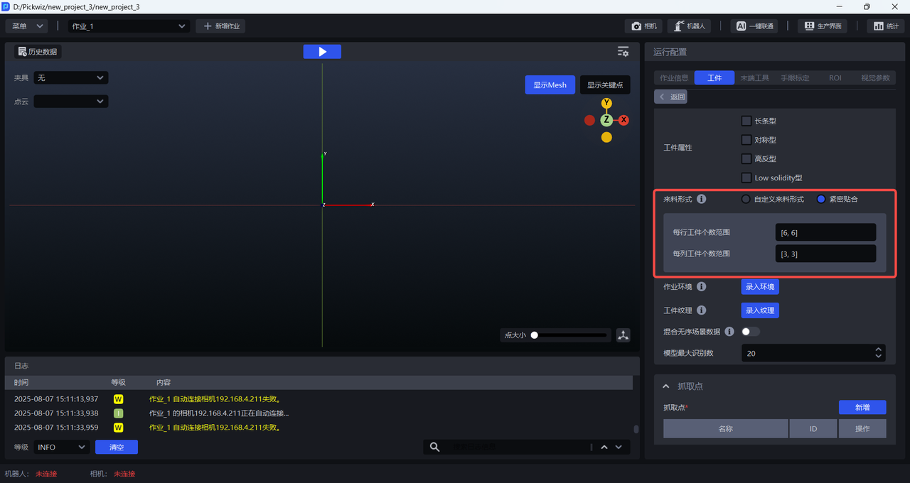 若工件有序来料、姿态一致、间距较小的场景,可点击紧密贴合,设置每行每列的工件个数,但工件总数必须小于 40,若工件数量超过40,需保证设置的行/列工件个数比值与实际的行/列工件个数比值有同一个公约比值,比如工件实际来料形式是每行12个每列8个,则行/列工件个数的比值是12:8,约分到最简是3:2,因此可以设置每行3个每列2个、每行6个每列4个均可,但每行9个每列6个不可(超过了40)。
