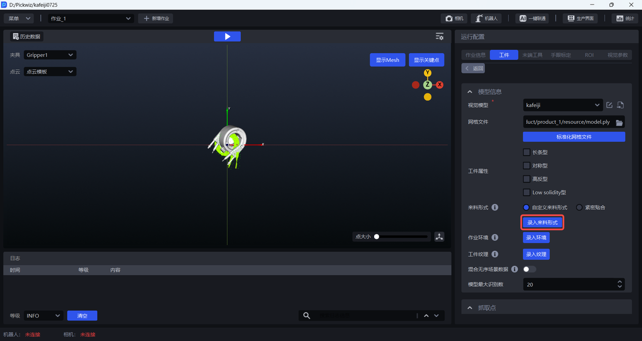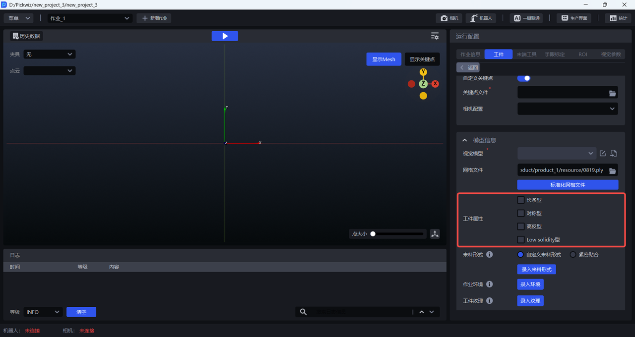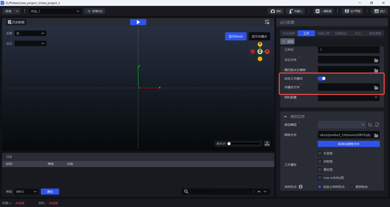 一键联通训练视觉模型时,通用工件正反面区别较大,因此需要上传关键点文件用于识别正反;面型工件正反面区别较小,因此无需上传关键点文件。请参照 点云模板制作指南制作通用工件的关键点。