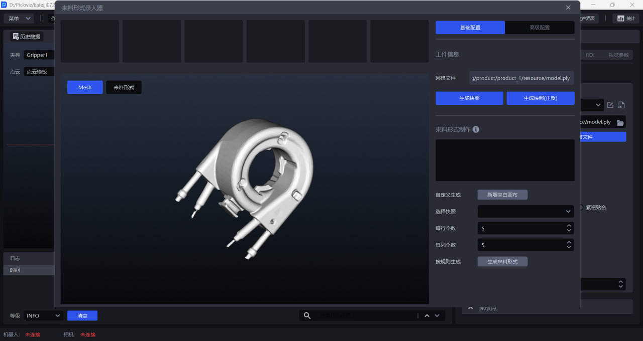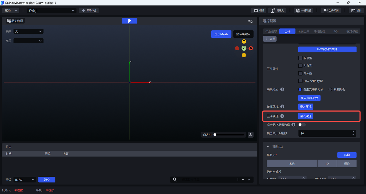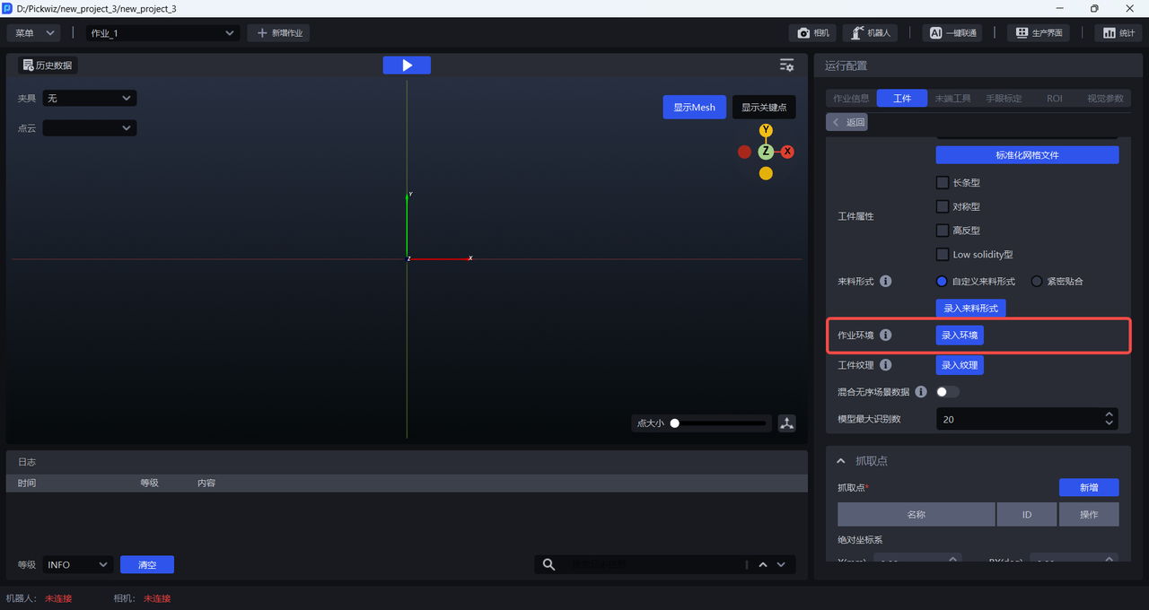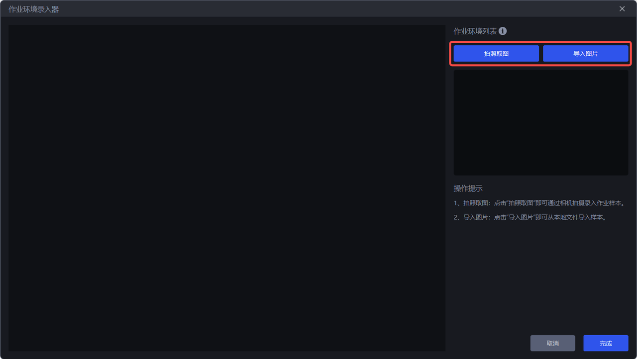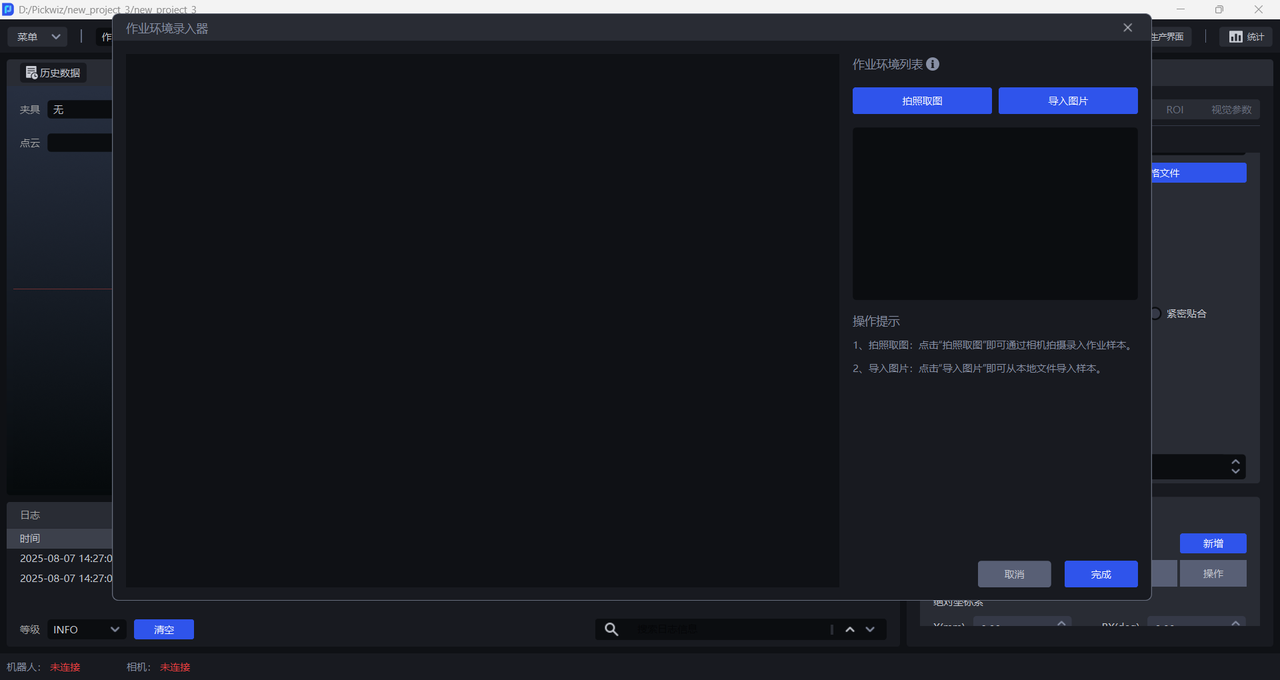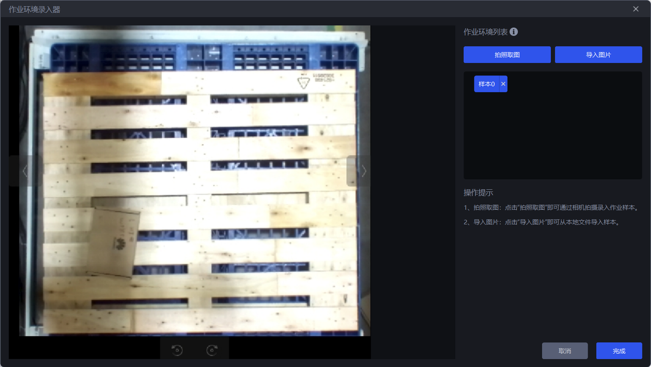 拍照取图采集相机视野下的作业环境,二是直接导入图片,作业环境图片不能包括工件和料框,可以包括托盘、底托。
