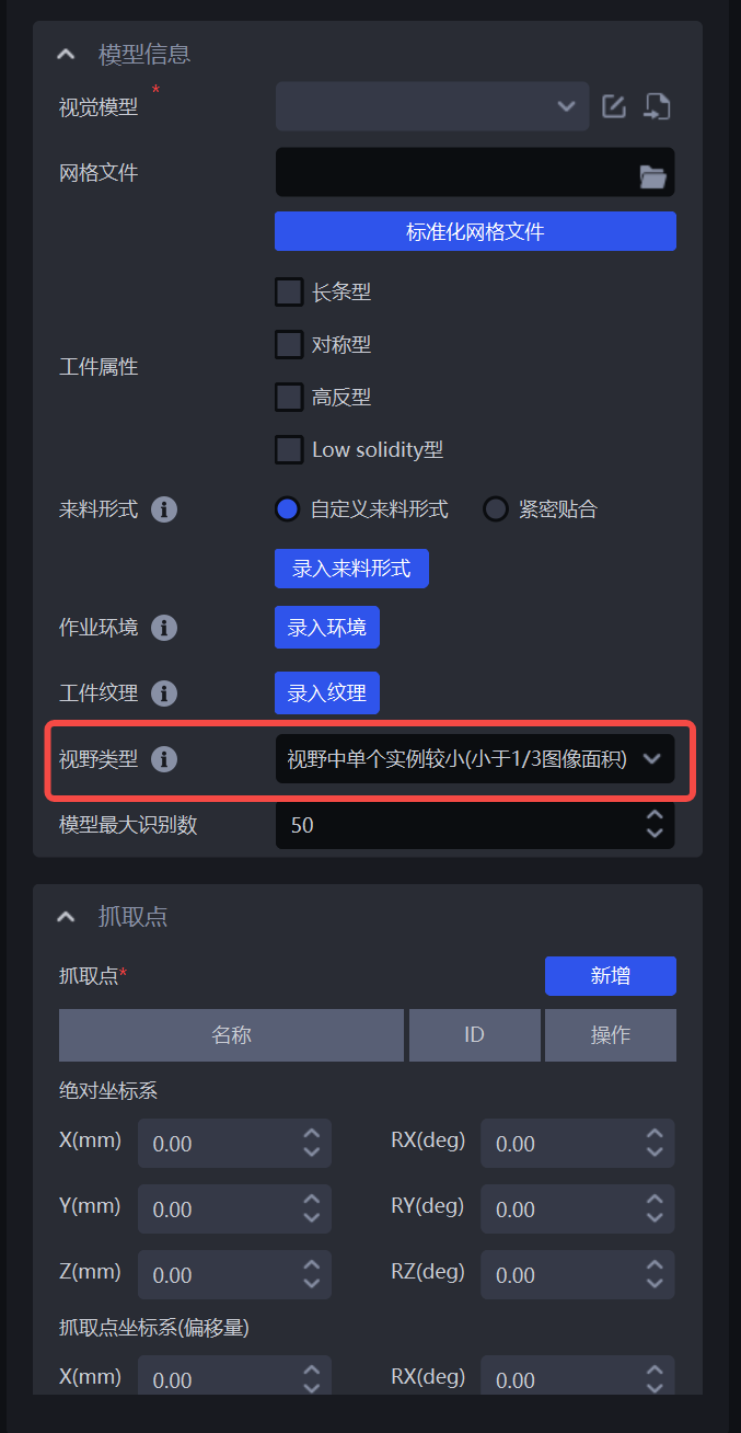 若不勾选工件属性,生成的训练数据不会特别考虑工件的指定特征(如对称性、高反材质等),导致训练出来的视觉模型的识别效果可能不够理想。