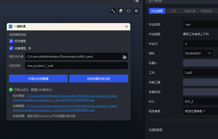 在PickWiz的一键联通弹窗中,同时勾选 视觉模型 、 成像模型 后,点击 仅导出训练配置 / 自动创建训练任务 。