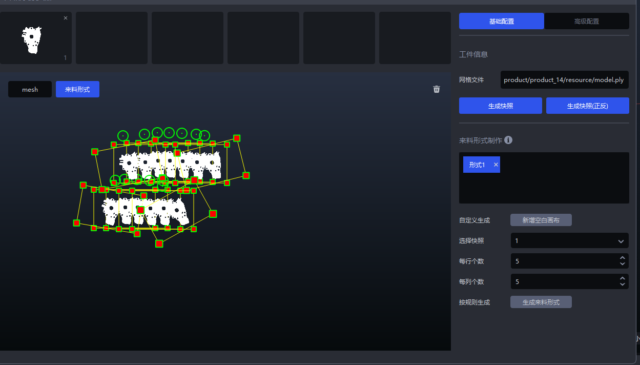 也可选择快照、设置每行个数、每列个数,然后点击生成来料形式 ,系统会按照选择的快照和设置的行列数,在画布上直接生成来料形式,如下所示。