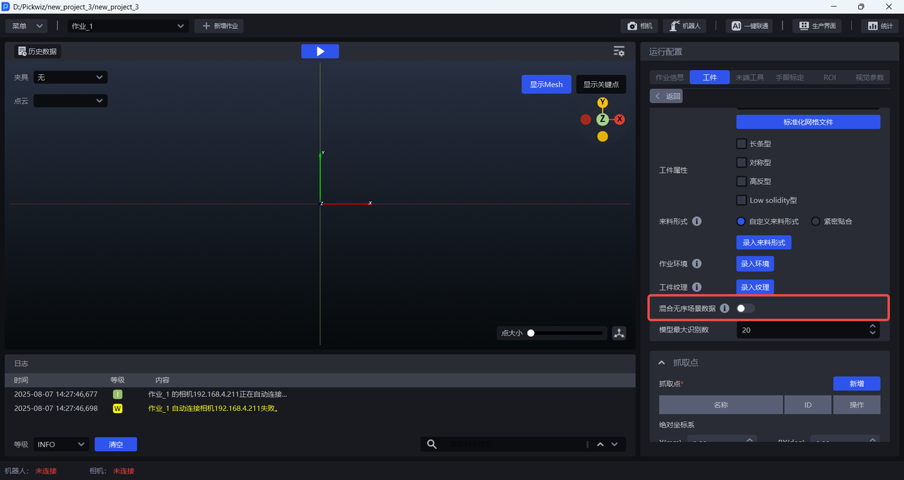示例:相机视野内只有一个工件时,可转化为有序场景,从而使用一键联通。需使用整体CAD模拟出遮挡识别面的效果。