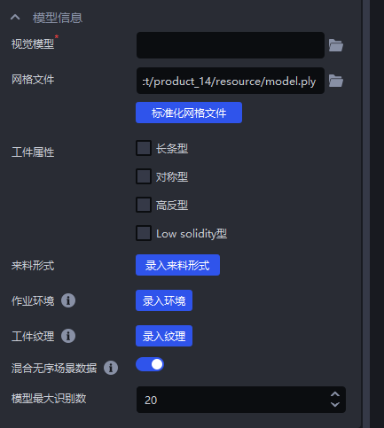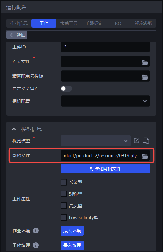 一键联通训练视觉模型时,通用工件和面型工件依赖网格文件来渲染出大量不同视角、光照条件下的合成图像,扩充训练数据,这样可以提高视觉模型的泛化能力。若面型工件较为简单、特征较少,可不上传网格文件。