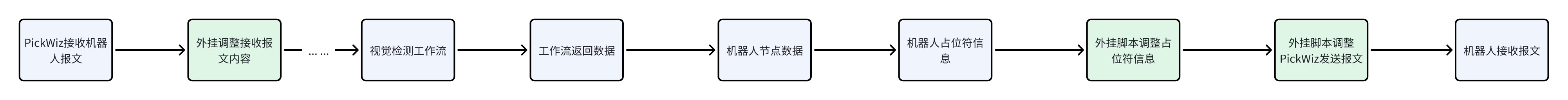 return data示例:固定作业配置(比如固定作业配置中 ROI 的 ID),当 PickWiz 接收到机器人指令时,会先检查当前上下文context 里的 ROI ID 是否为 1,如果不是 1,就自动把指令内容改成 “d,0,0,0,0,0,0,1”,以此将 ROI ID 固定为 1,避免现场因 ROI 配置错乱导致抓取、检测等作业出错。