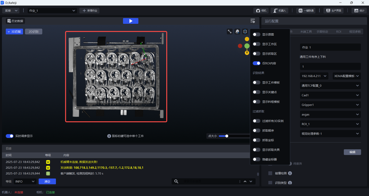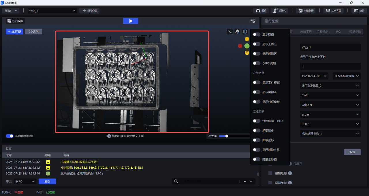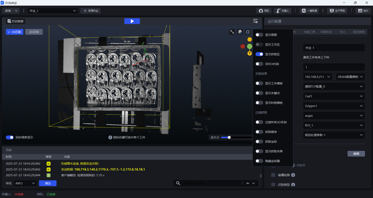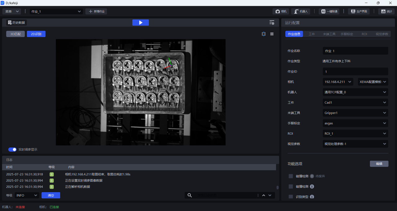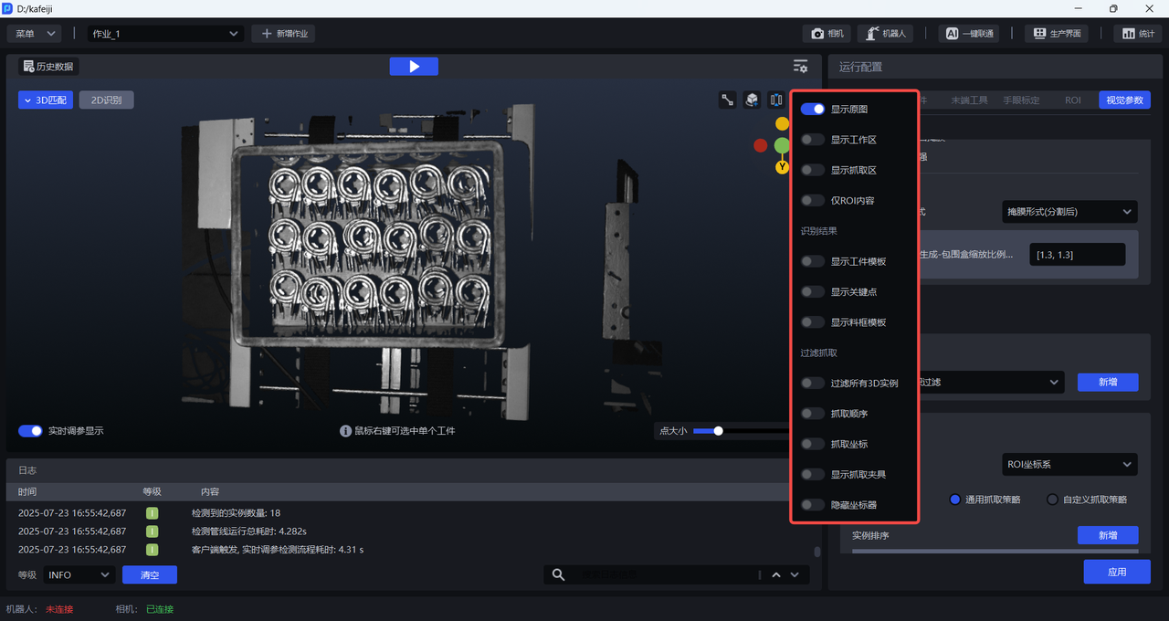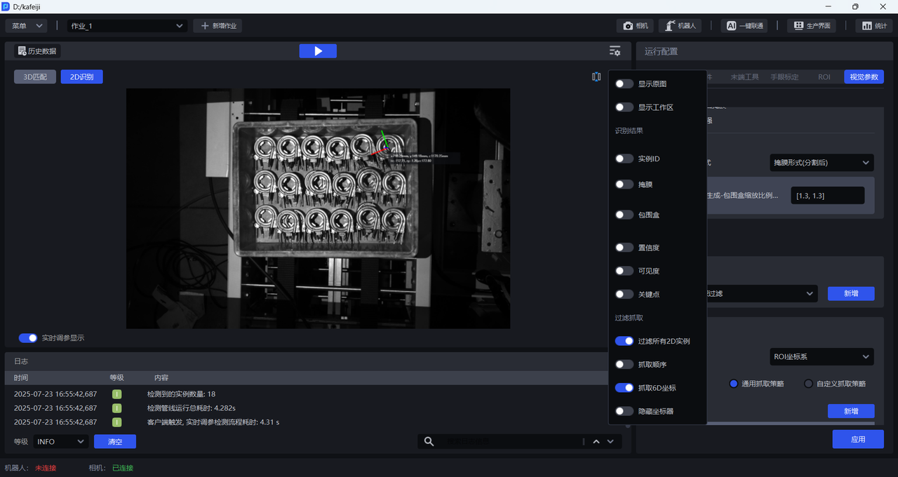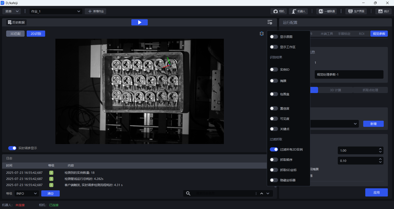打开视觉参数界面,修改2D识别、3D计算、抓取点处理下的视觉参数,可参照视觉参数调整文件进行调整。