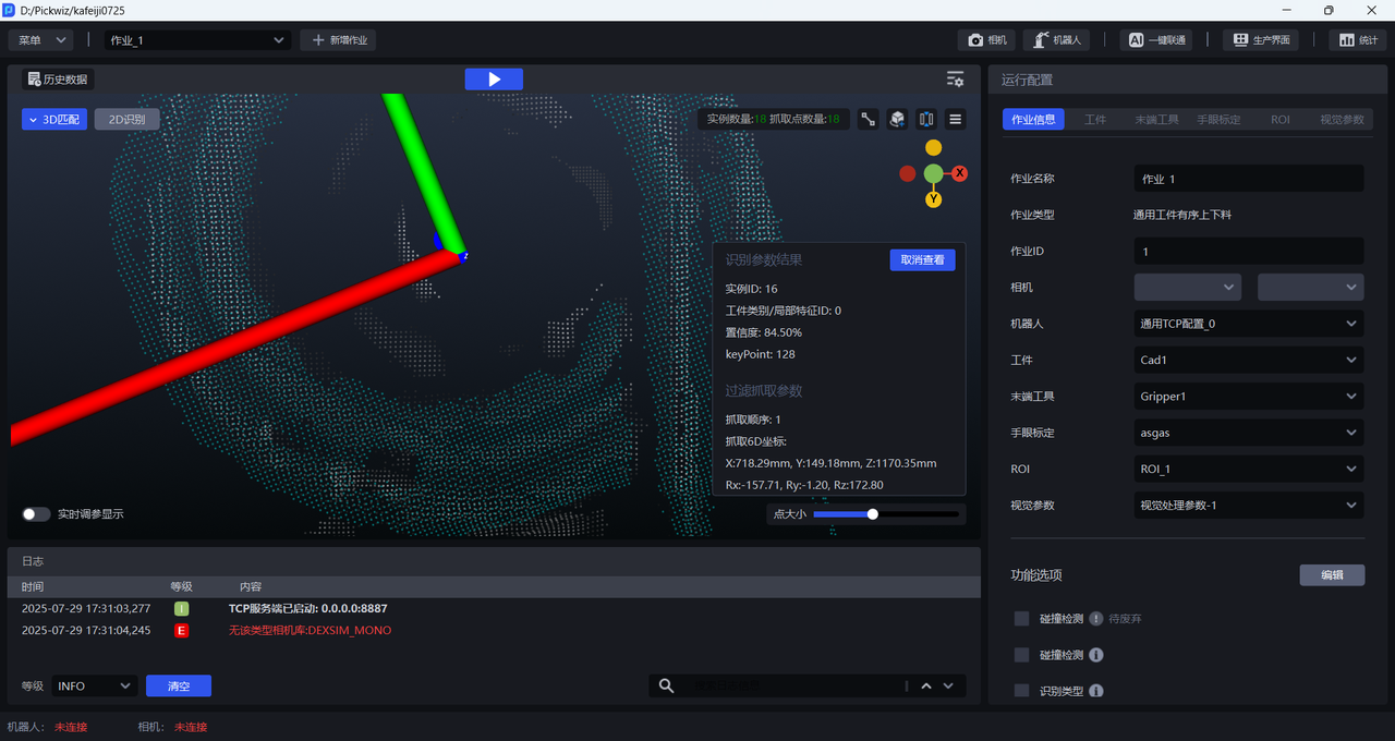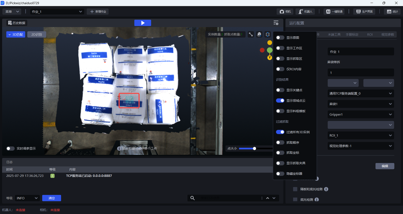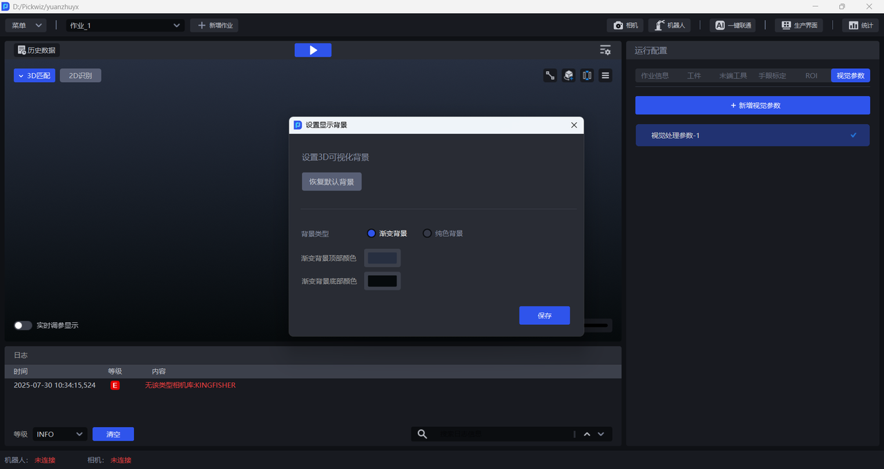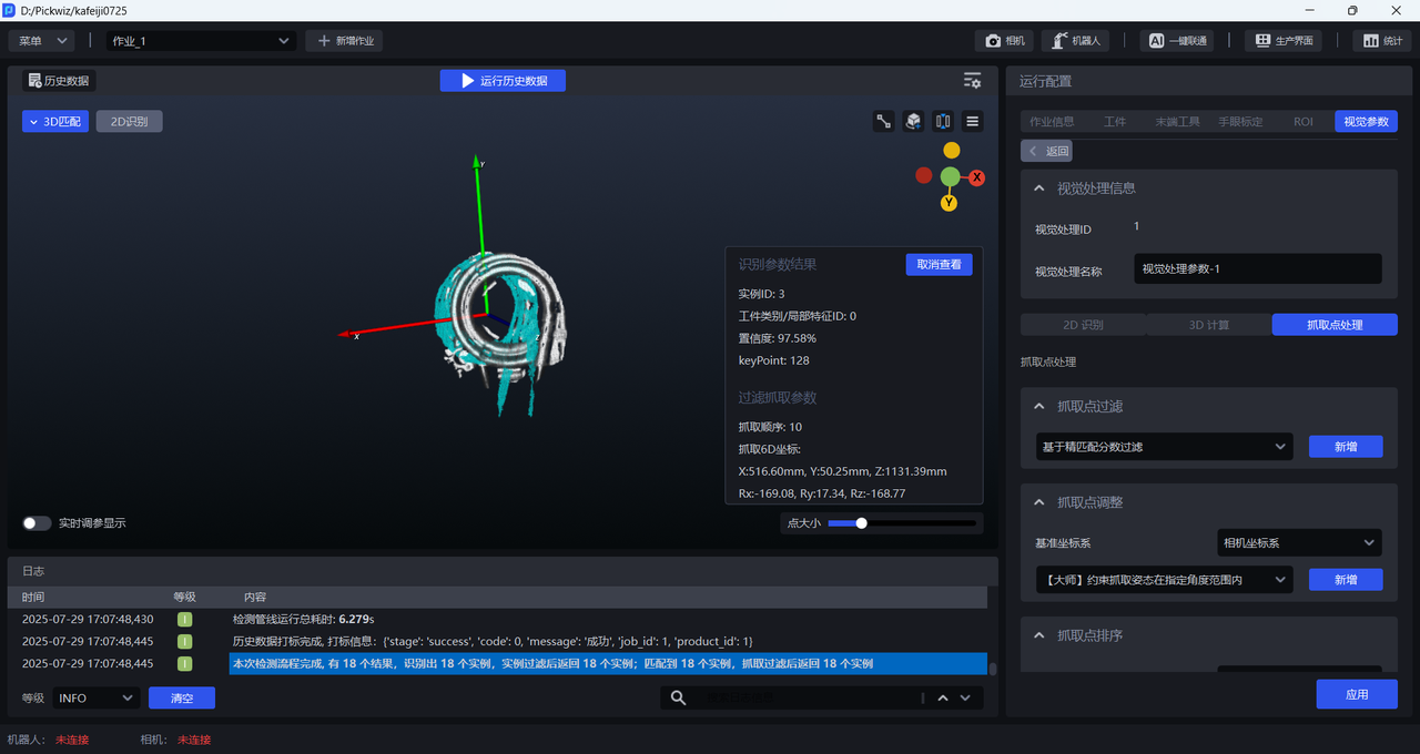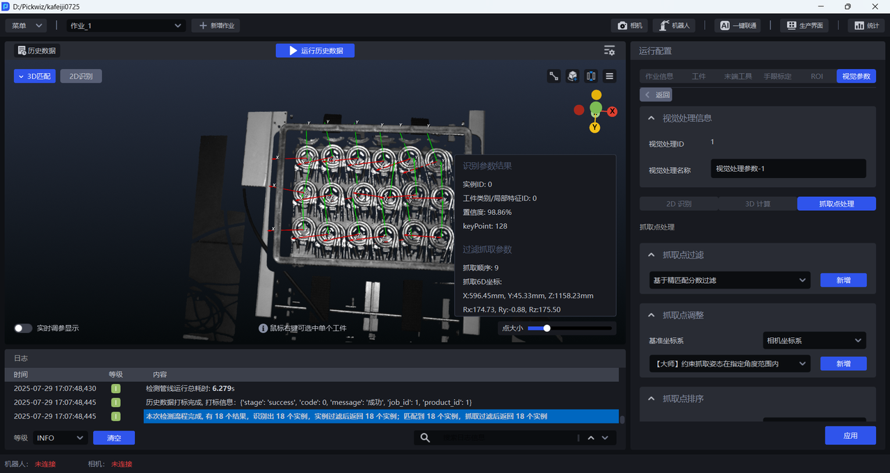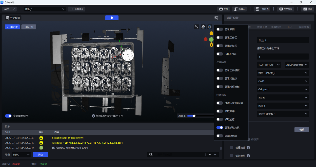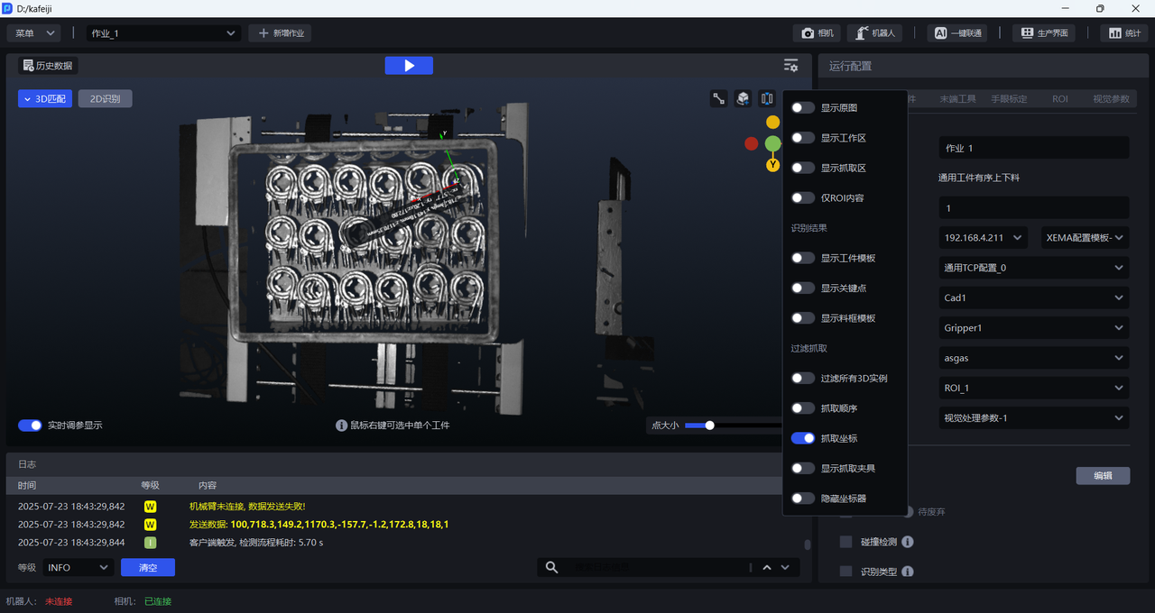 打开视觉参数界面,修改2D识别、3D计算、抓取点处理下的视觉参数,可参照视觉参数调整文件进行调整。