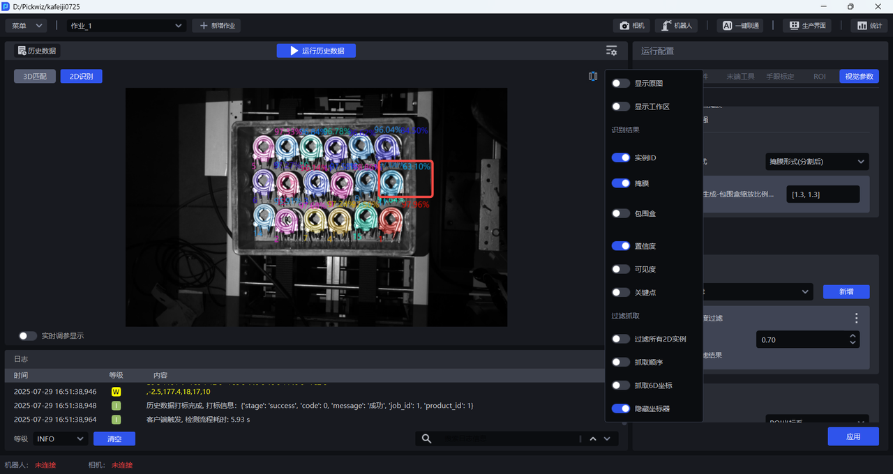 光标放在不同工件上,可查看每个工件的视觉识别结果,如下图所示。