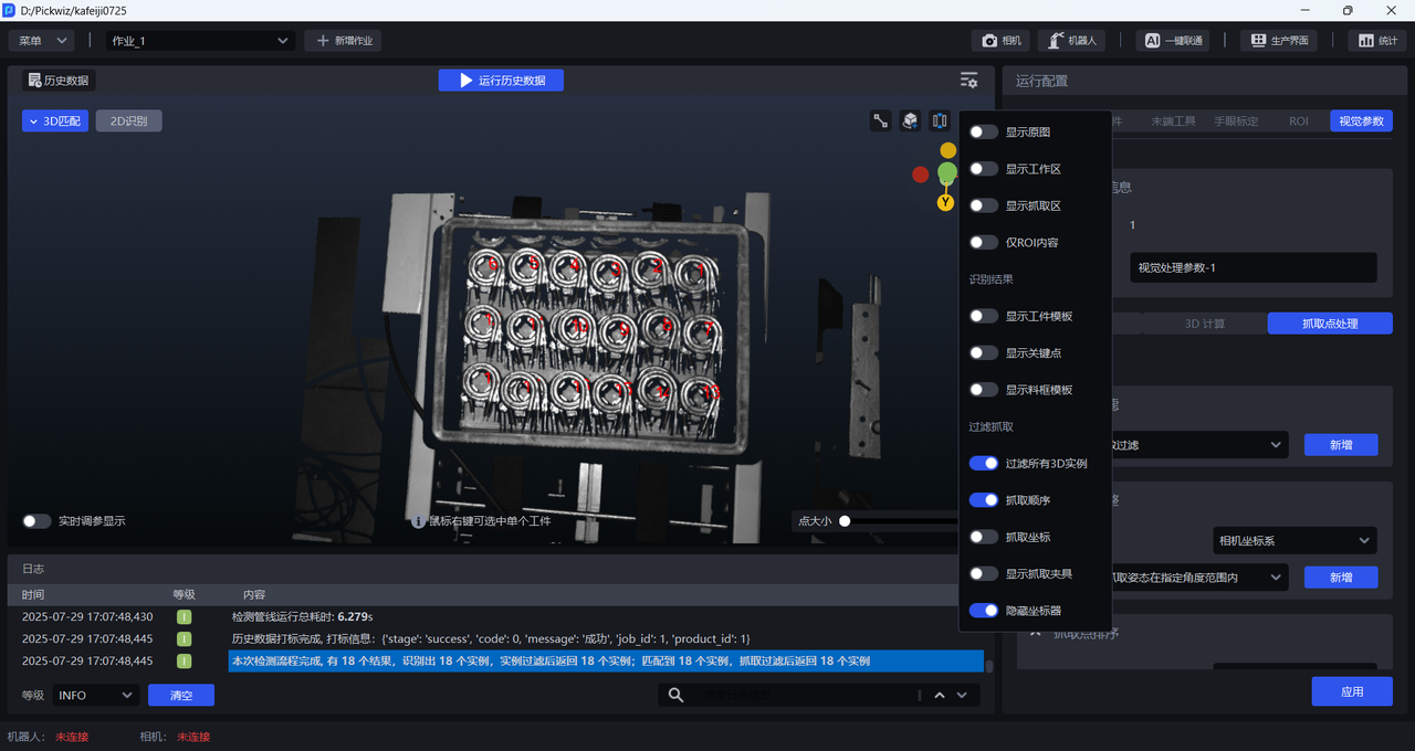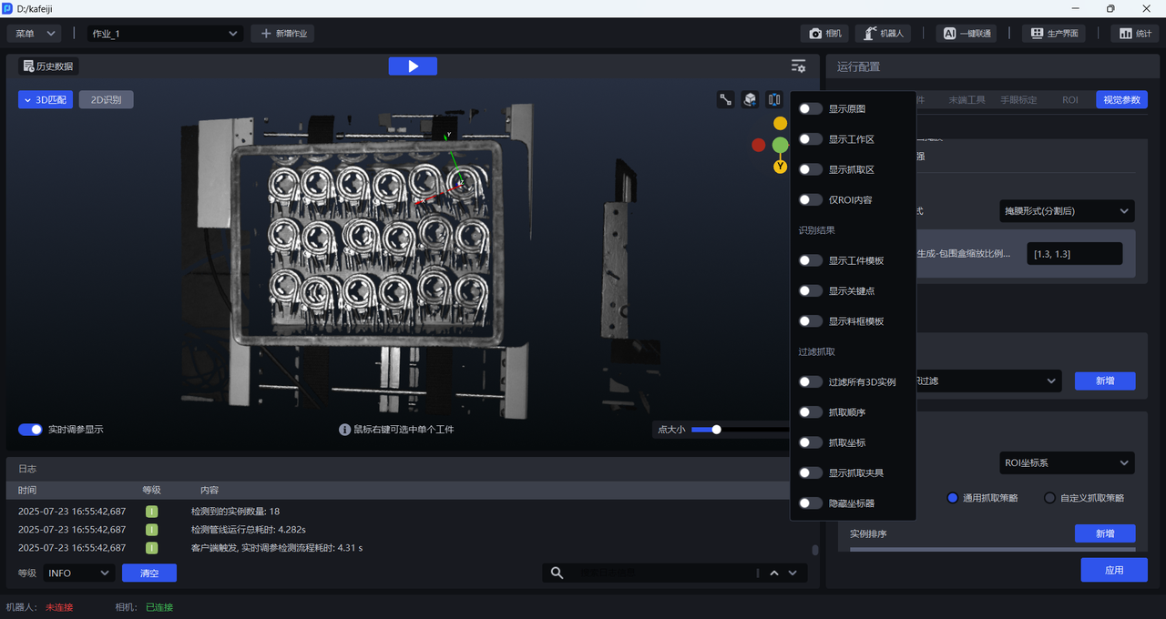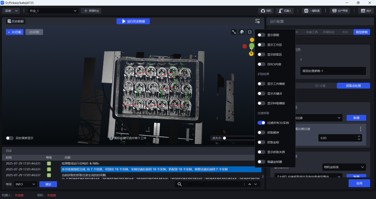 关闭过滤所有3D实例时,显示3D计算节点输出的抓取点,如下图所示,18个工件都生成了抓取点。