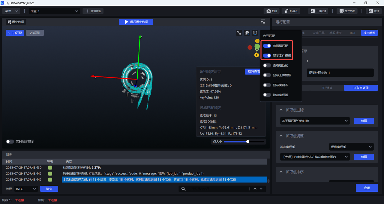 选中单一工件后,可查看工件的点云模板和精匹配结果。