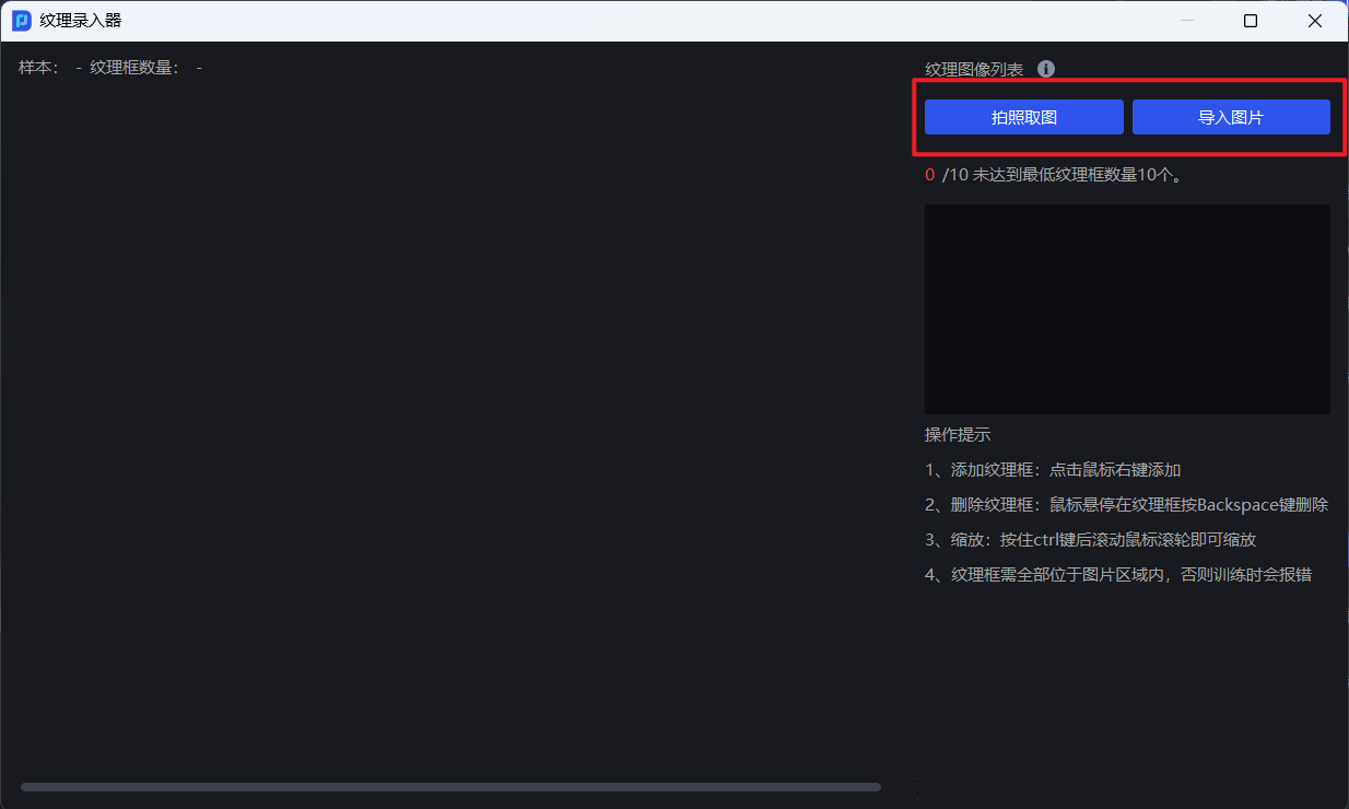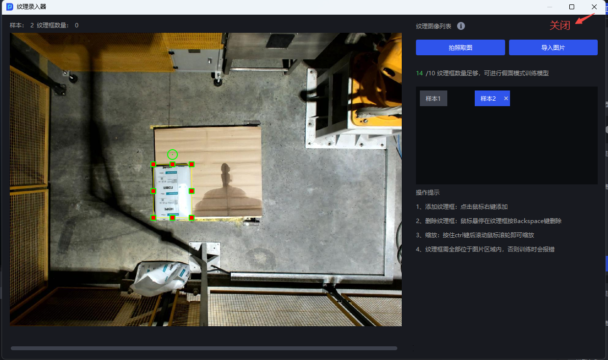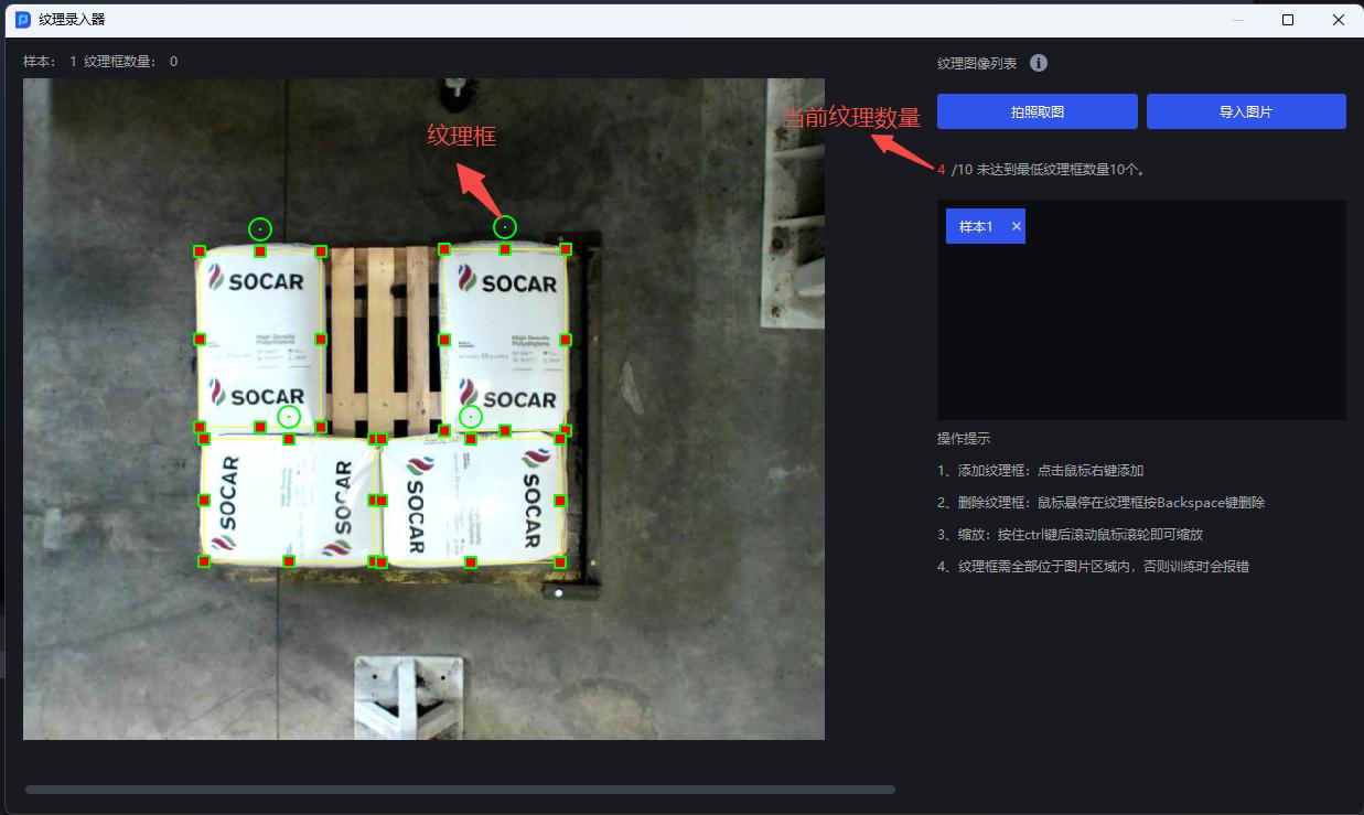 在工件界面,点击录入纹理,在纹理录入器中查看框取的纹理是否包含了所有的情况,例如药盒的正面和反面