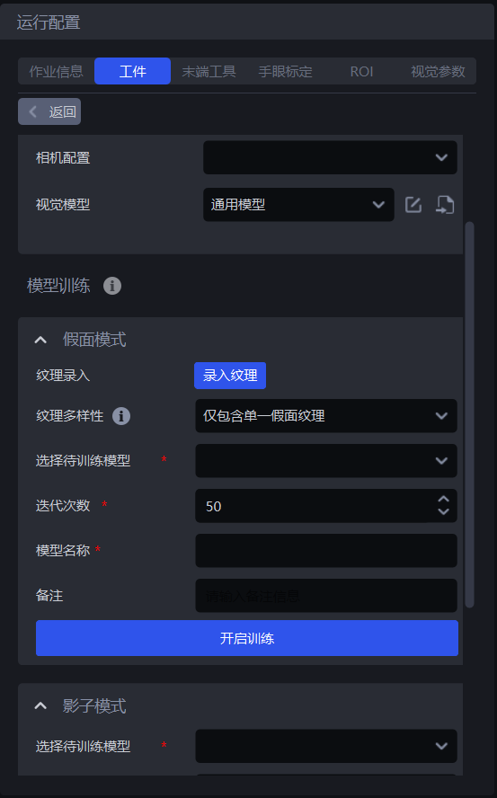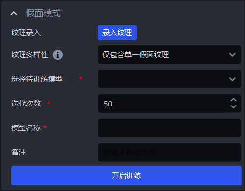 仅包含单一假面纹理和包含多种假面纹理。若框取的纹理只有一种,则选择仅包含单一假面纹理;若框取的纹理有多种,则选择包含多种假面纹理。选择待训练模型,迭代次数保持默认值,设置模型名称,最后点击开启训练