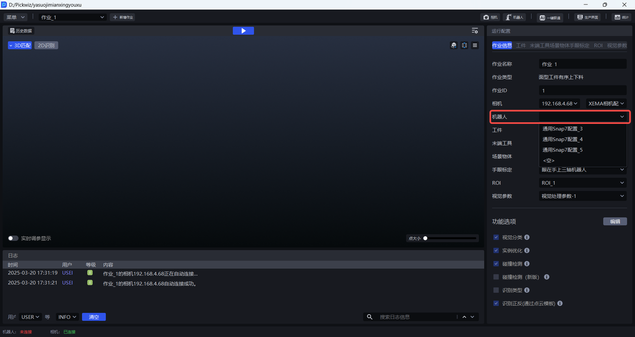 完成 西门子Snap7 通信配置后,可在作业主界面为当前的作业场景选择机器人配置,在机器人配置选择栏选择相应的机器人配置,PickWiz 将尝试与机器人通过 西门子Snap7 通信协议建立通信。