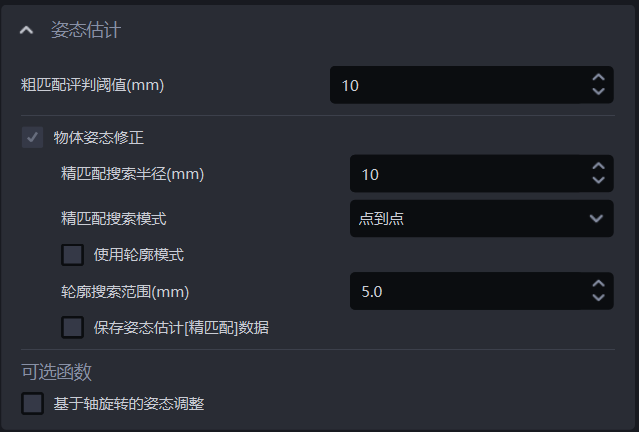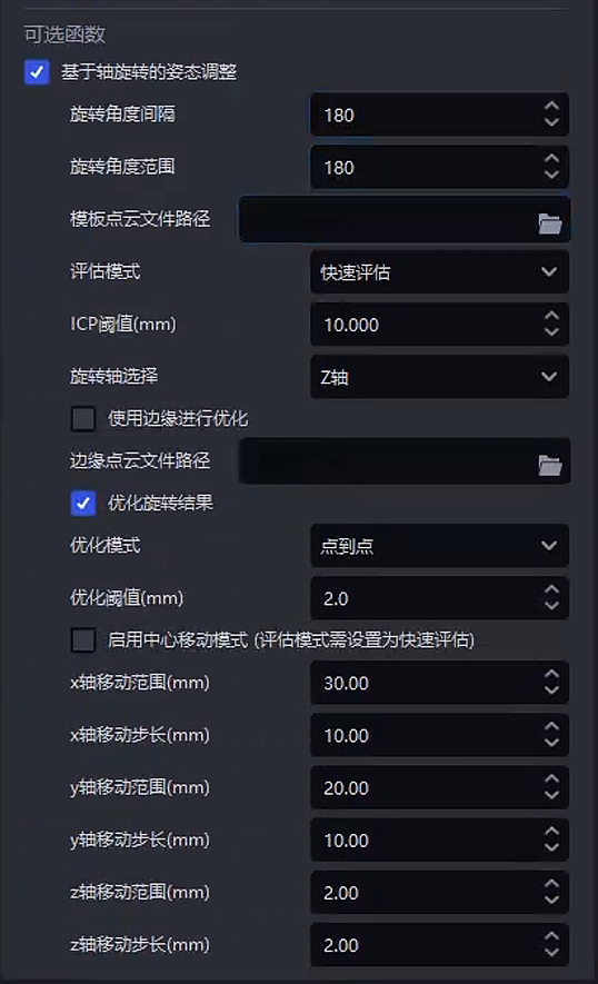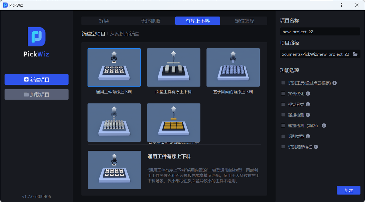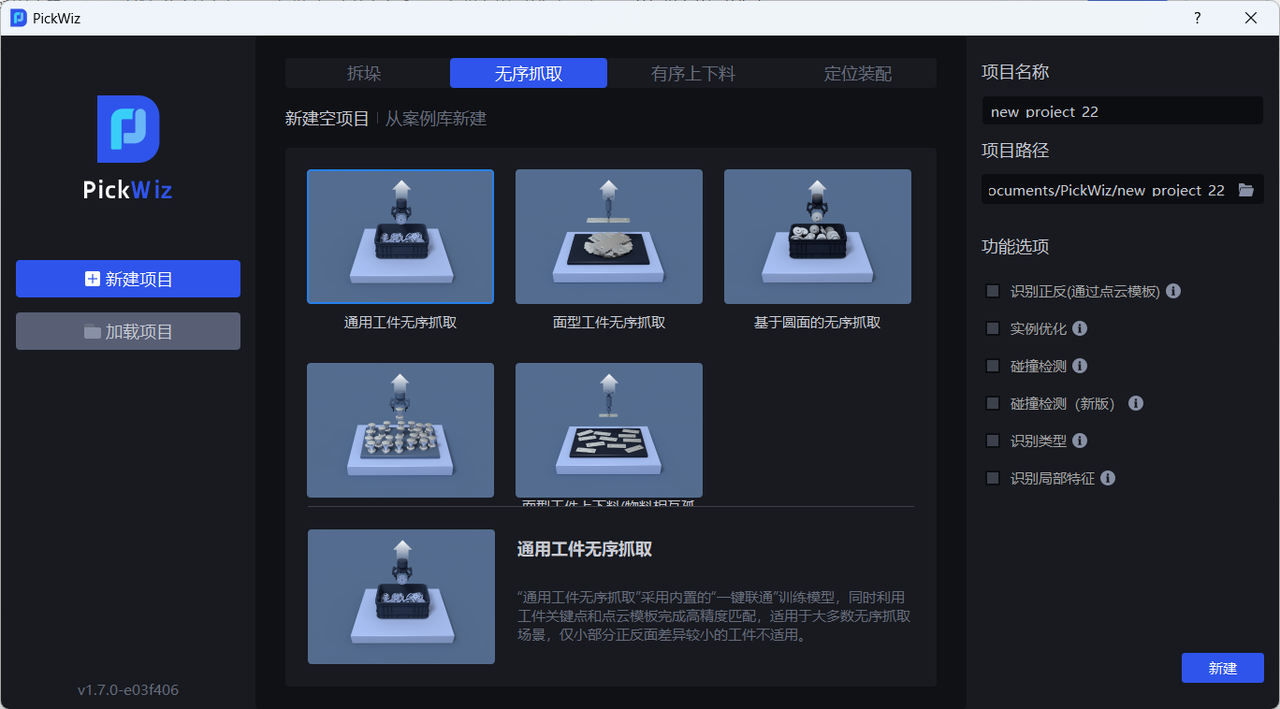 (5)可选的功能选项:实例优化、碰撞检测、碰撞检测(新版)、视觉分类、识别类型、识别正反(通过点云模板)、识别局部特征
