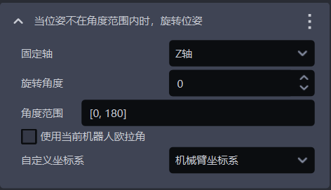 | RZ(°) | RZ旋转量的下限, 例如参考抓取点的RZ旋转量为180, 下限设置为10, 则允许的范围为(默认度数会跳变): [[-180, -180+上限], [170, 180]] | 180 | 角度° |