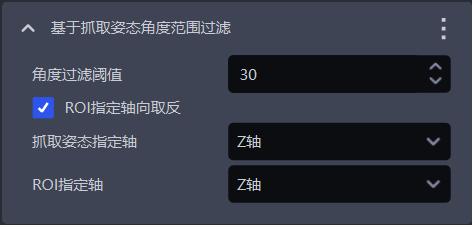 | 角度过滤阈值 | 计算ROI 的指定轴与抓取姿态的指定轴之间的最大夹角,夹角大于当前阈值的抓取点将被过滤 | 30 | [-360, 360] | 角度° |