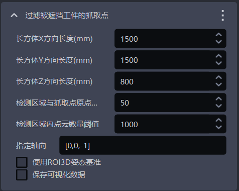 | 检测区域内点云数量阈值 | 目标检测区域内遮挡物点云数量超过该阈值,则认为该抓取点被遮挡 | 1000 | [0, 100000] | / |