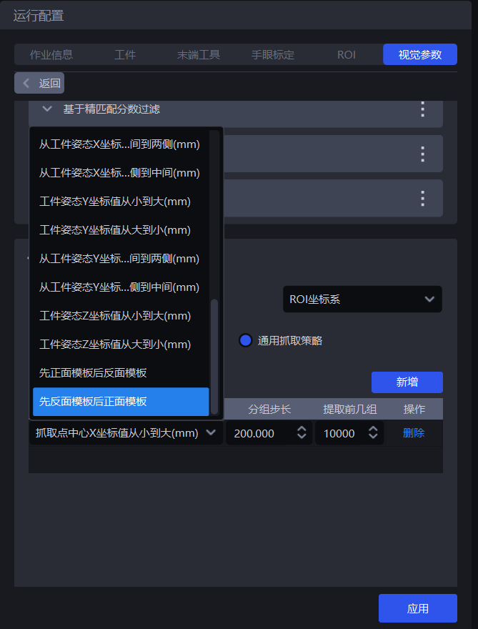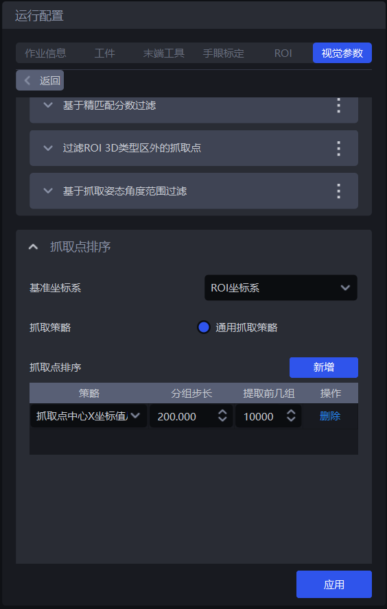 | 抓取点中心X/Y/Z坐标值从大到小/从小到大(mm) | 使用抓取点中心的X/Y/Z坐标值进行分组排序 使用该策略进行排序前应当先设置基准坐标系 | 200.000 | [0, 10000000] | 10000 |