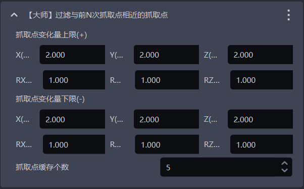 | 抓取点缓存个数 | 缓存的抓取点个数,当前抓取点比较完成后将实时增加到缓存中 | 5 | [1, 100] | / |