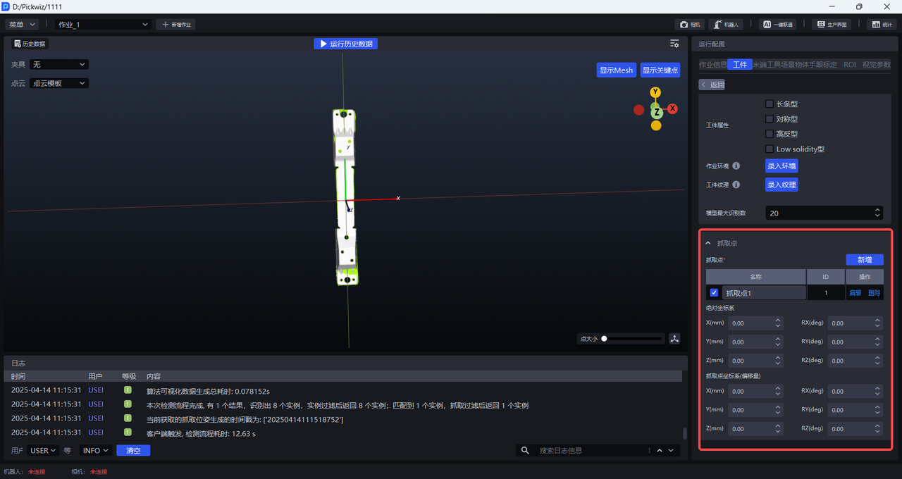 识别正反(通过点云模板):可导入工件正面和反面的点云模板,来匹配抓取工件的正面或反面,且可以针对工件正面或反面分别进行抓取点设置。识别正反(通过点云模板)使用指南
