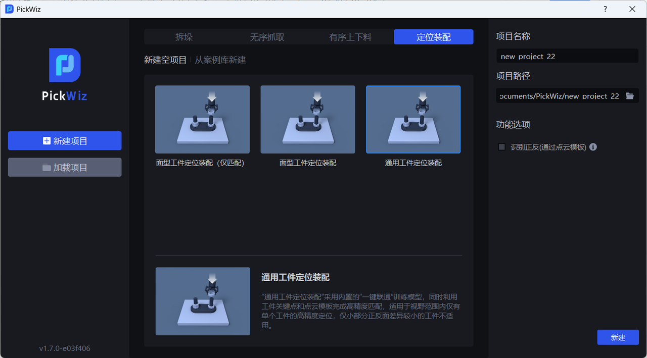 (1)新建一个通用工件有序上下料/通用工件无序抓取/通用工件定位装配项目(项目名称、项目地址可以自定义,项目名称不能有中文)
