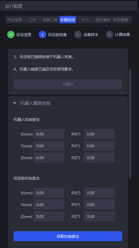 在标定前,需确认机器人精度是否满足项目要求,若不满足,需在标定前校验机器人精度;