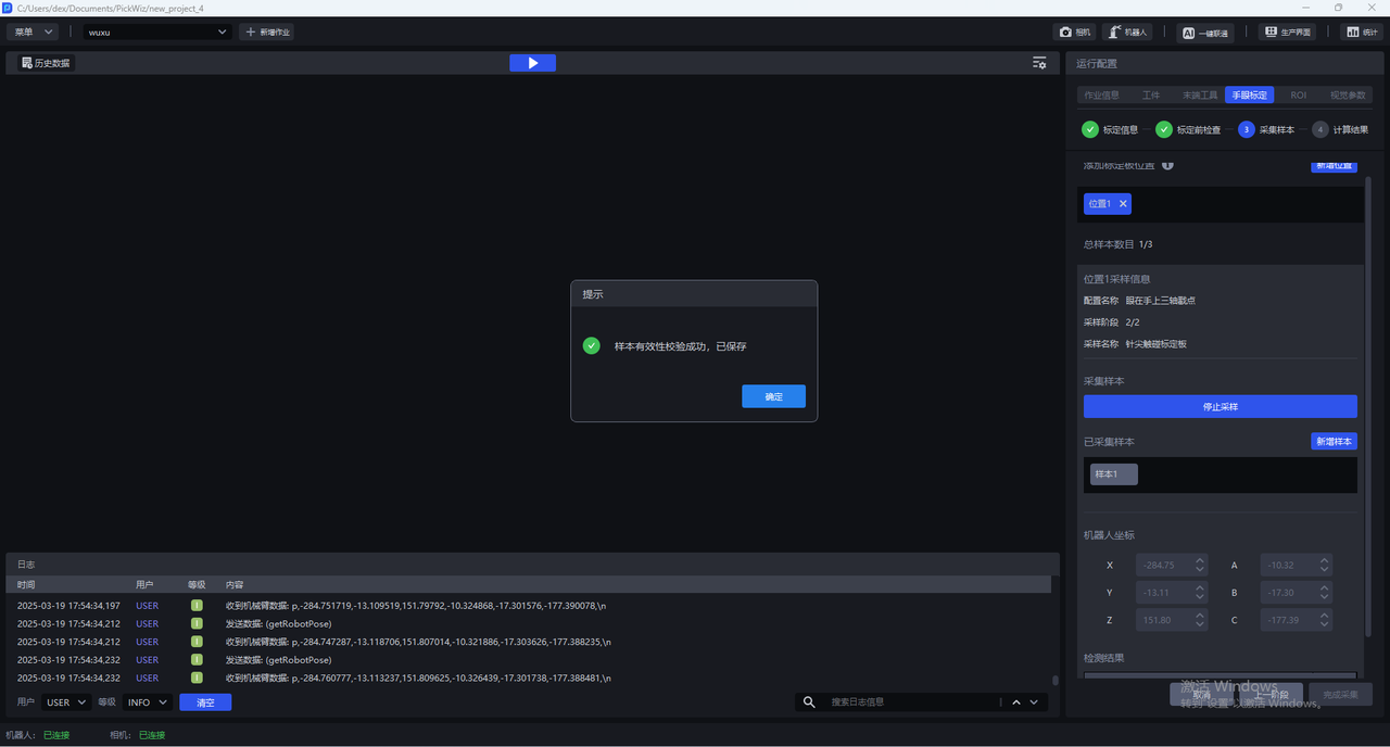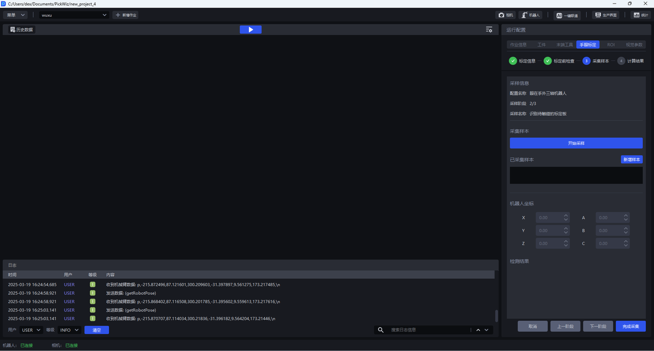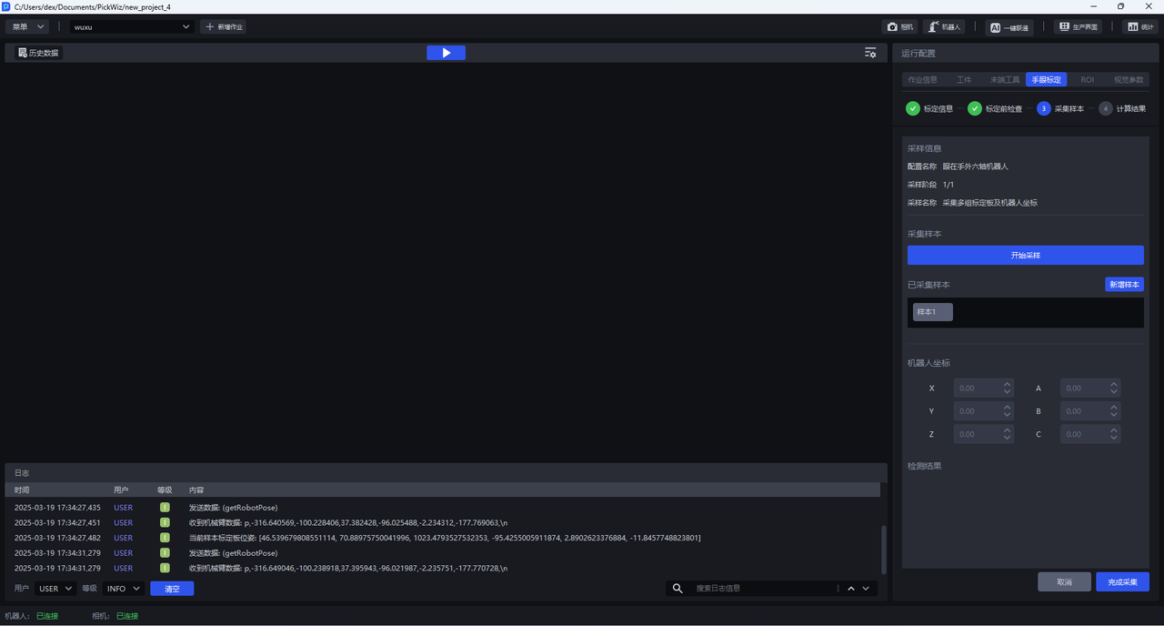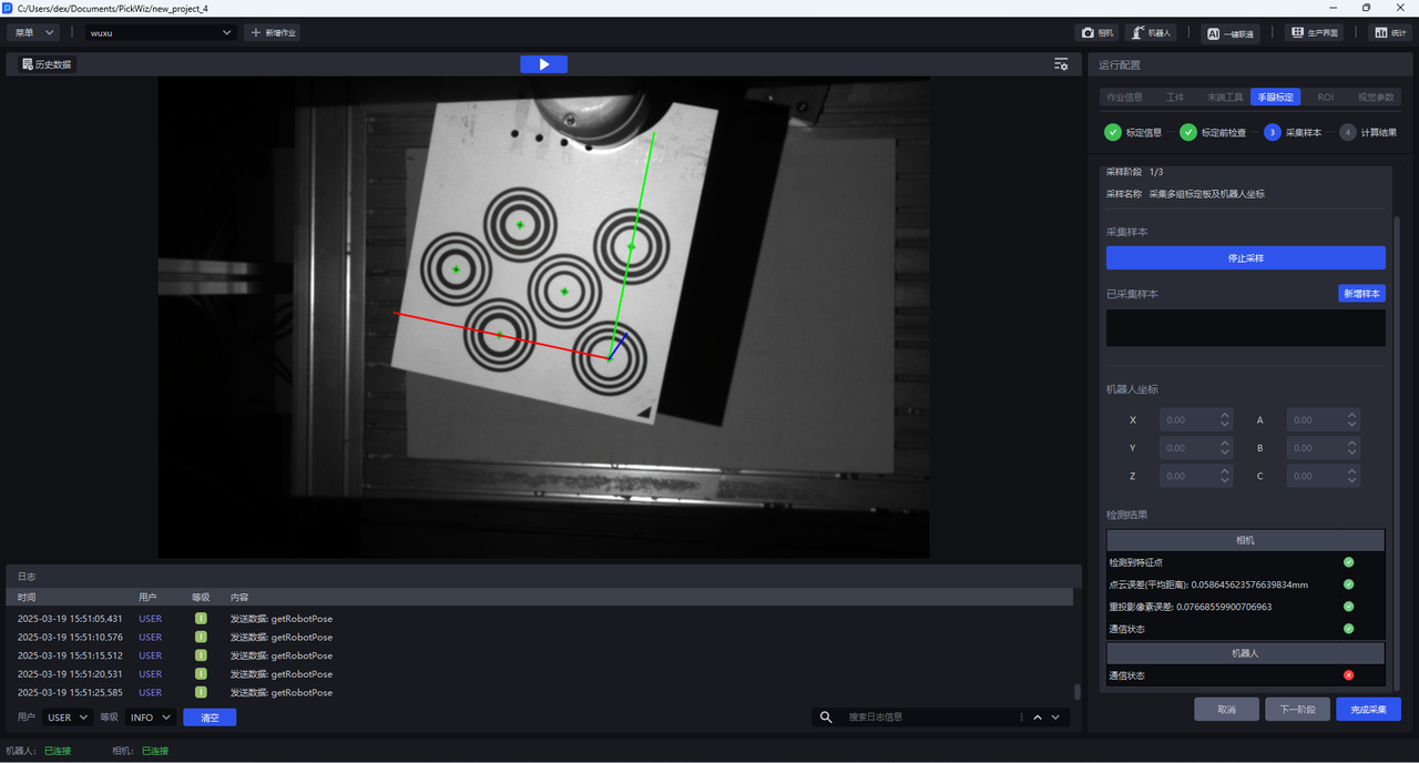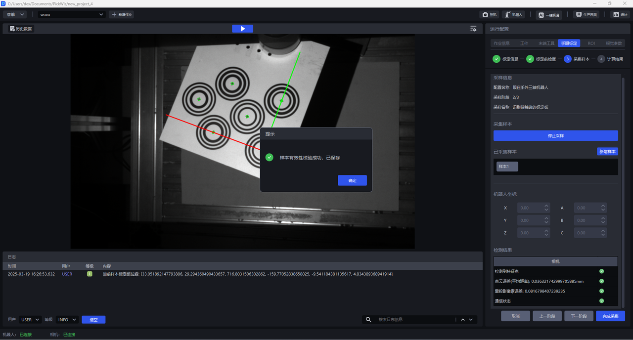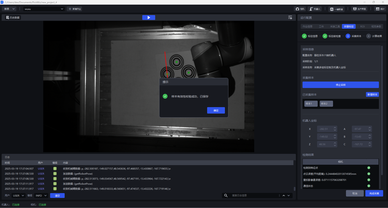 (2)点击开始采样,开始采样按钮会变成 停止采样,下方检测结果栏会出现相机与机器人两类检测,相机检测和机器人检测全部为绿色图标表示检测通过,如果有红色图标表示不通过,应当检查。