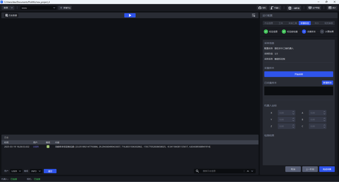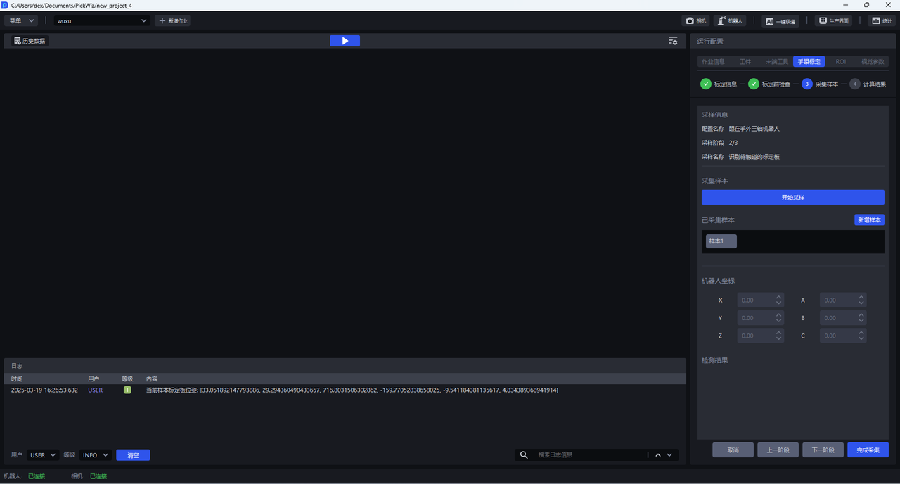 (1)调整标定板位置,将其放置在工件摆放的区域内,点击开始采样。