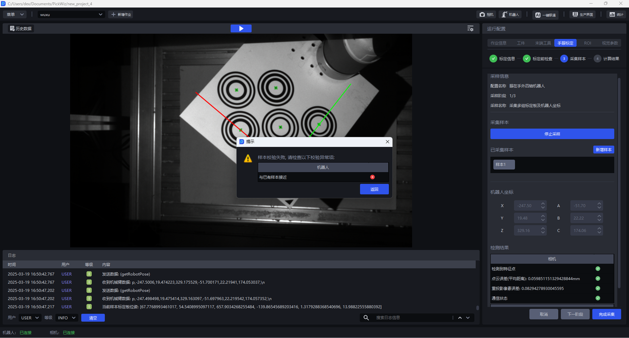 若样本与已有样本接近,则样本无效,会出现样本校验失败弹窗,提示与已有样本接近,点击返回后控制机器人携带标定板移动重新采集样本。