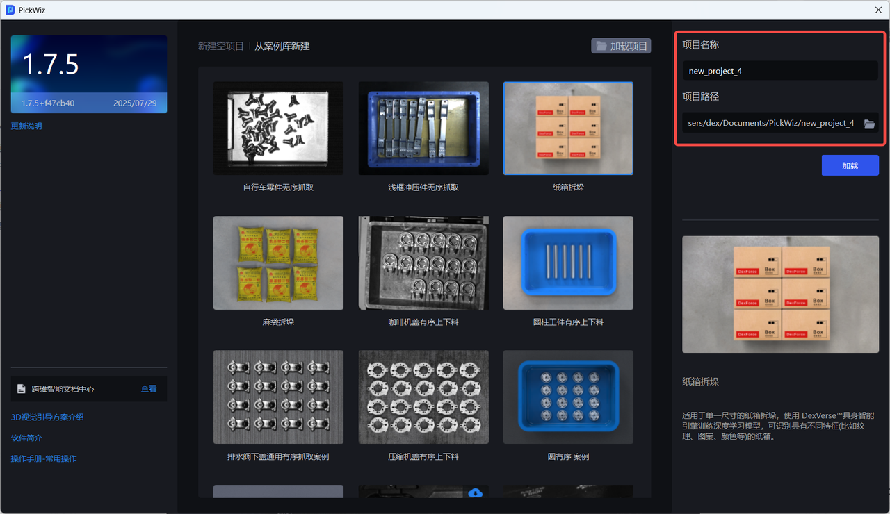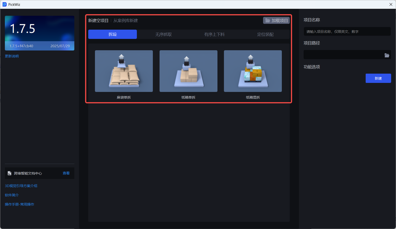项目是 PickWiz 的核心工作单元,包括机器人配置与通信、手眼标定、视觉参数等多个功能和作业配置,为机器人完成抓取任务提供高效灵活的解决方案,满足麻袋纸箱拆垛、无序抓取、有序上下料、定位装配等多类型的工业场景需求。