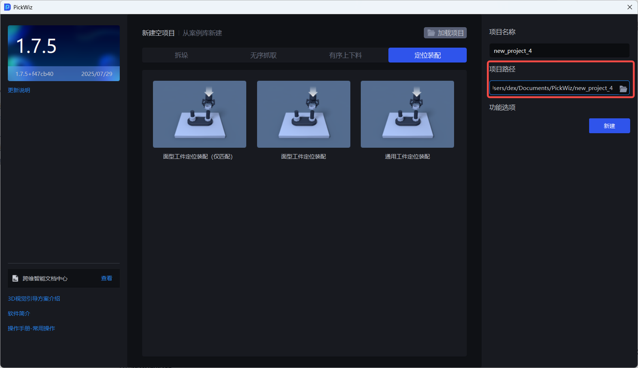 ③选择项目路径,默认项目的存储路径是C:\Users\dex\Documents\PickWiz,可自行修改