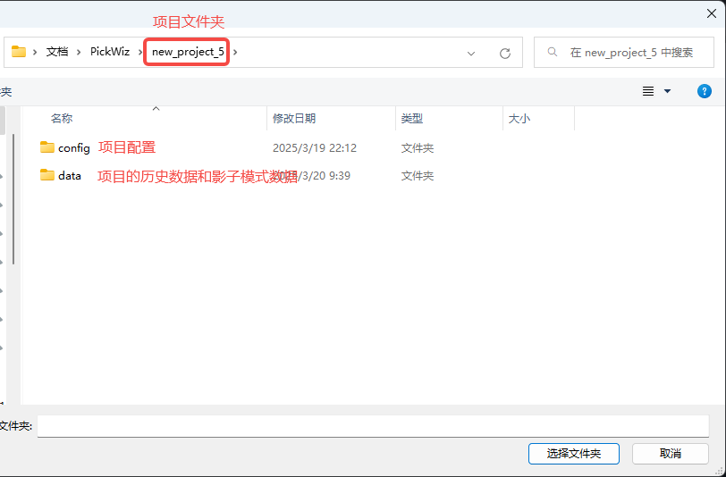 打开对应的项目文件夹,选中项目,点击选择文件夹。默认的项目存储路径C:\Users\dex\Documents\PickWiz。