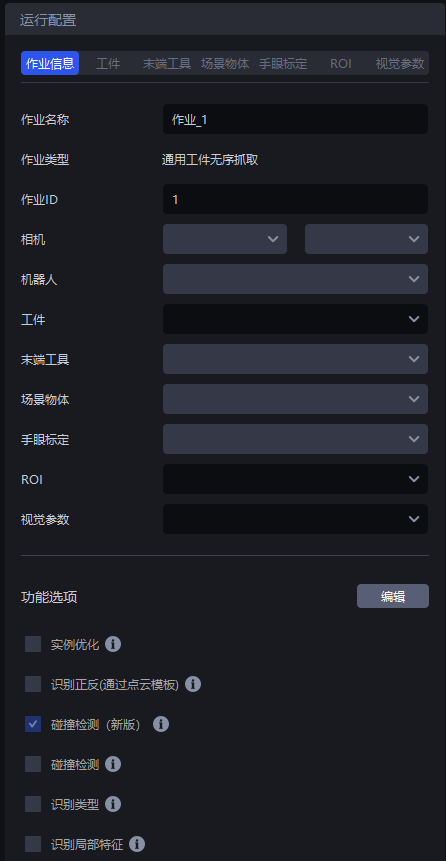 | 功能选项 | 点击"编辑",可选"碰撞检测"、"识别类型"、"识别局部特征"、"底托检测"等工况属性,选中和项目相关的工况属性,PickWiz 会根据选择的工况属性,匹配适配工况的功能配置,即在工件、视觉参数等相关配置中,添加选择的工况相关的配置。相关功能请查阅 功能选项使用指南 |