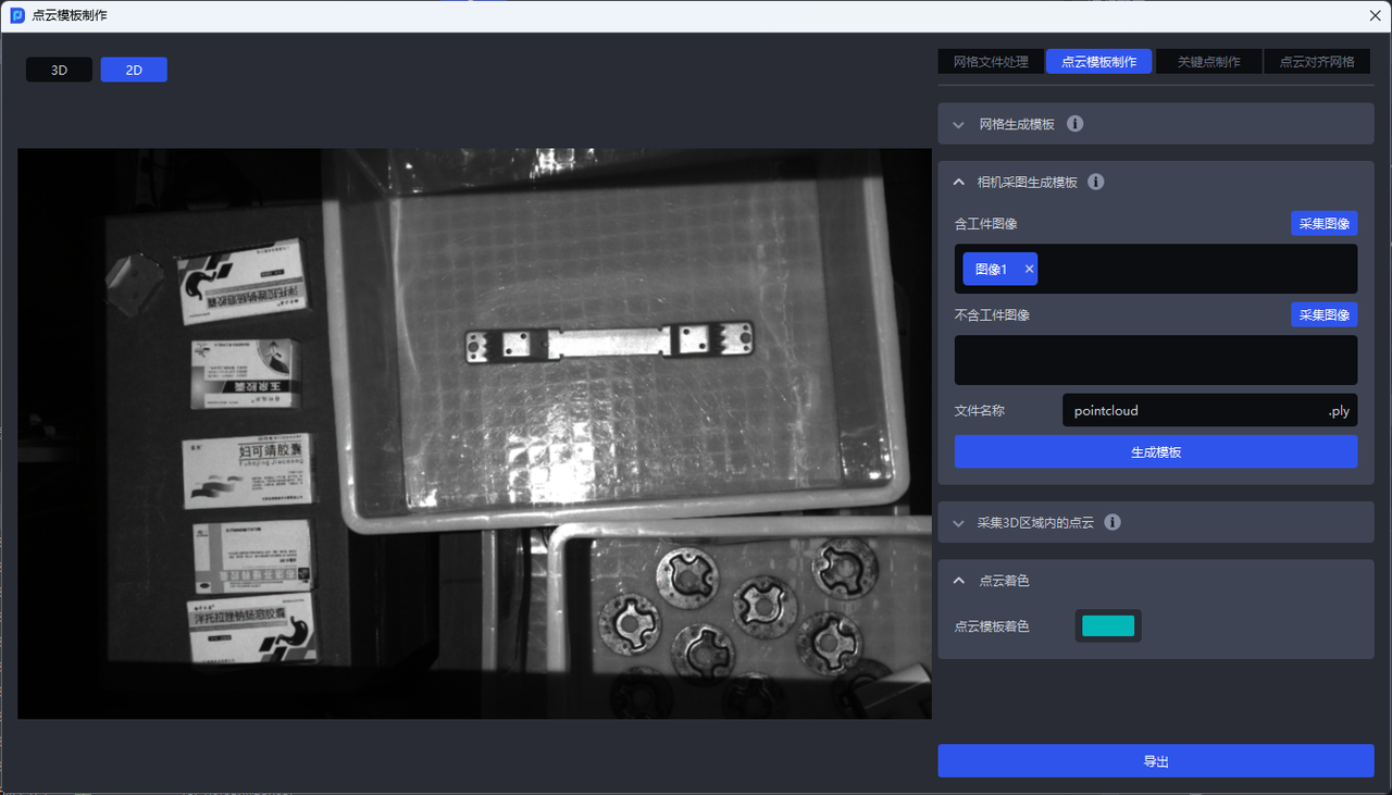 | 相机采图生成模板 | 通过相机采集两次图像(一张含工件、一张不含工件),计算两图差集得到工件的点云模板 | 相机采集的工件点云和通过标准化网格生成的工件点云模板一致性较差的情况。 |