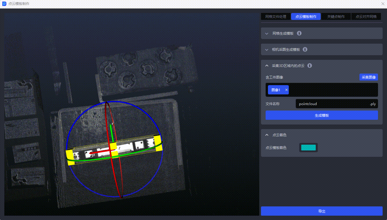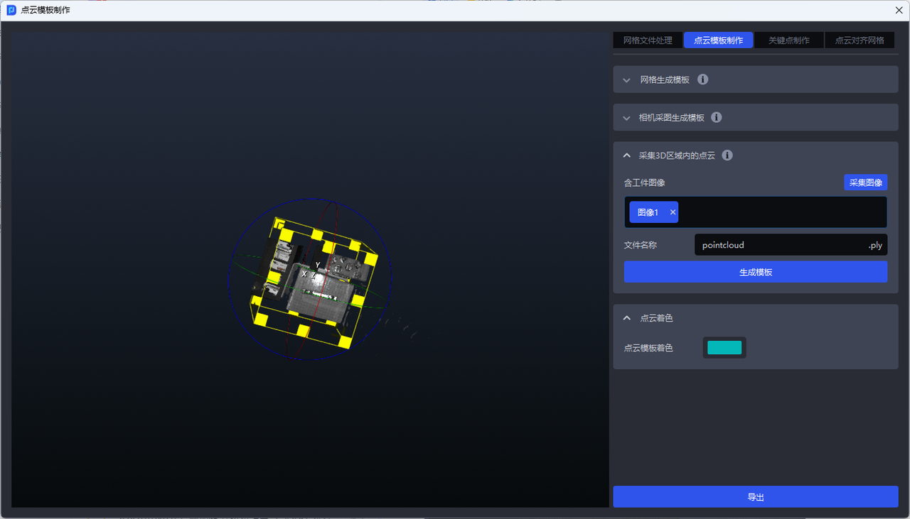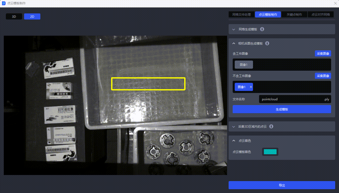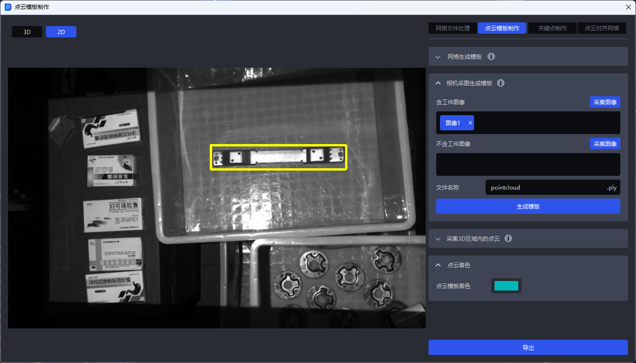 在相机采集的含工件的点云图中,用3D包围盒框选出工件点云,点击 生成模板 即可获取点云模板文件,如下图所示。