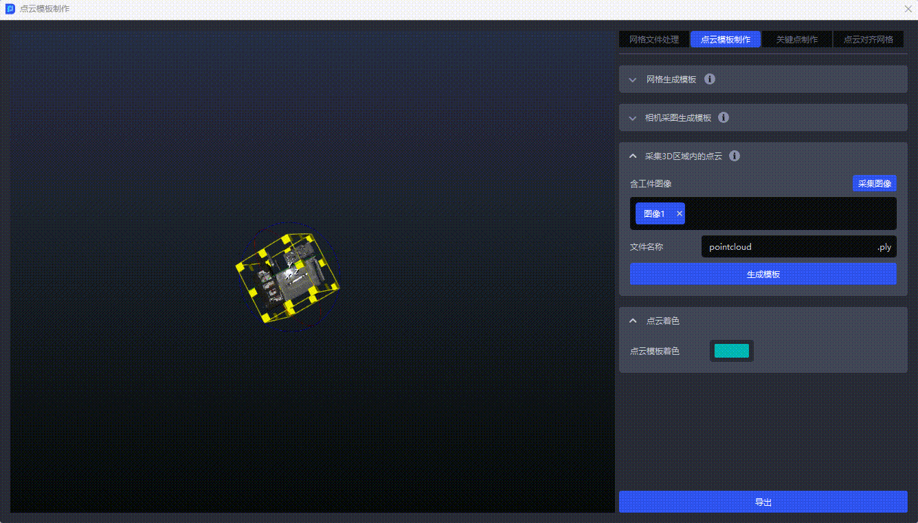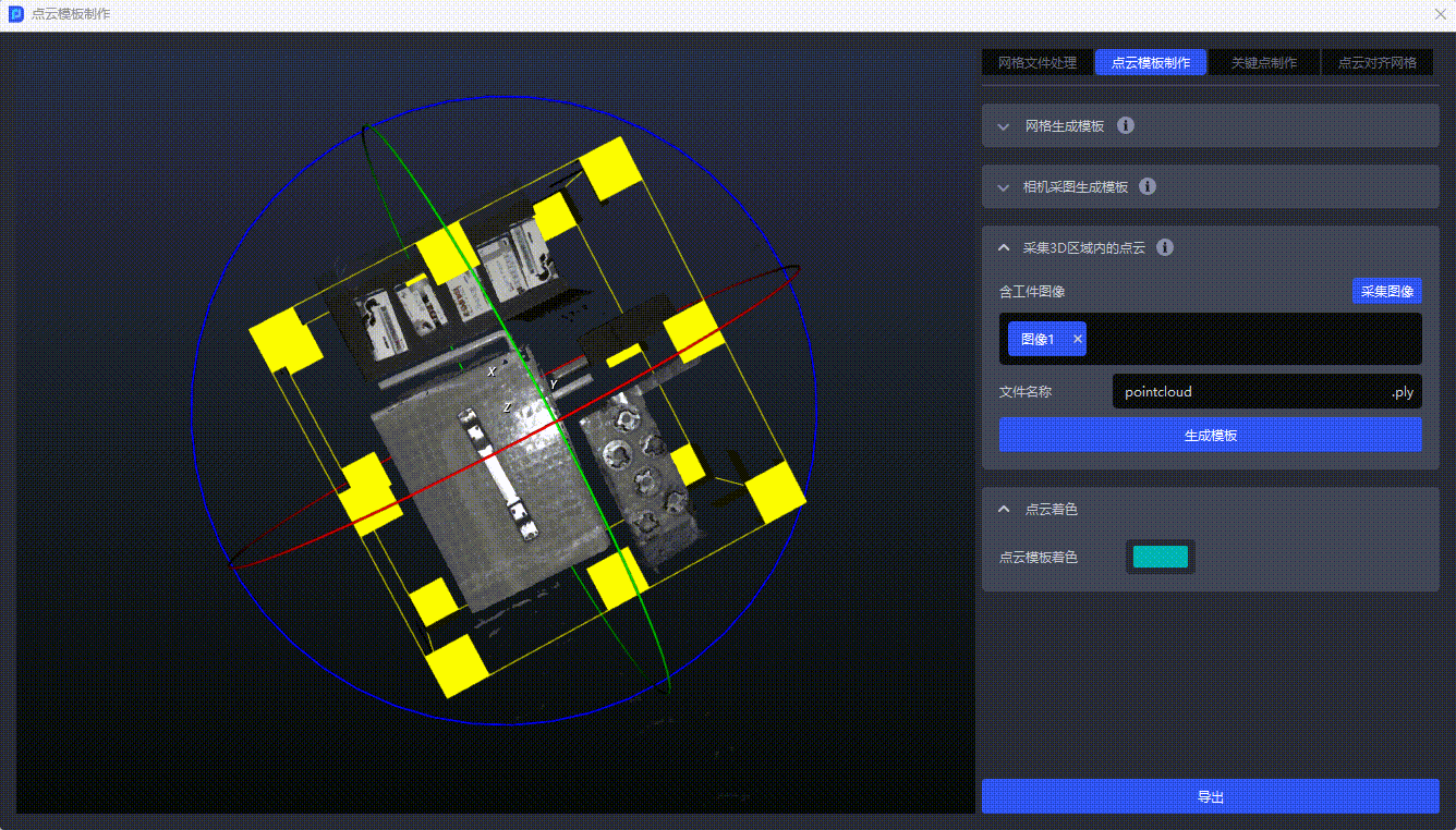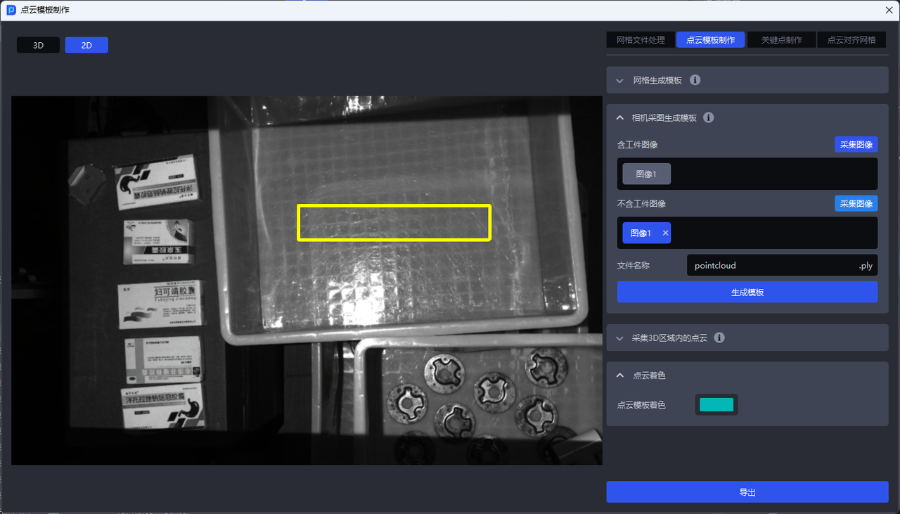 在相机采集的含工件的点云图中,用3D包围盒框选出工件点云,点击 生成模板 即可获取点云模板文件,如下图所示。