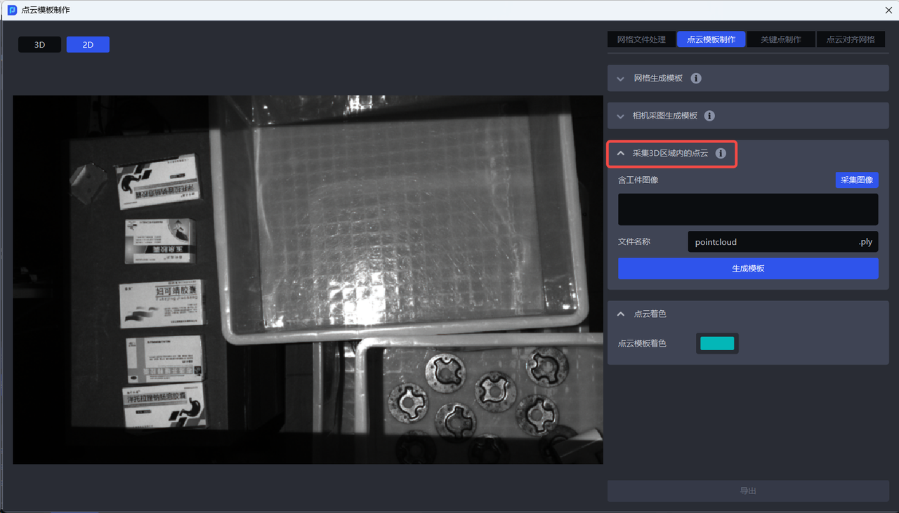 | 采集3D区域内的点云 | 在相机采集的含工件的点云图中,用3D包围盒框选出工件点云,点击 生成模板 即可获取点云模板文件。 | / |