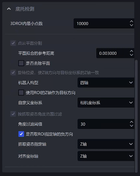 | 3DROI内最小点数 | 如果在ROI 3D工作区内提取的点云数量小于该值,则表示工件已经抓取完毕,自动进入底托检测部分 | 10000 | 0-100000 | 取值应该小于单个工件的点云数量 | |