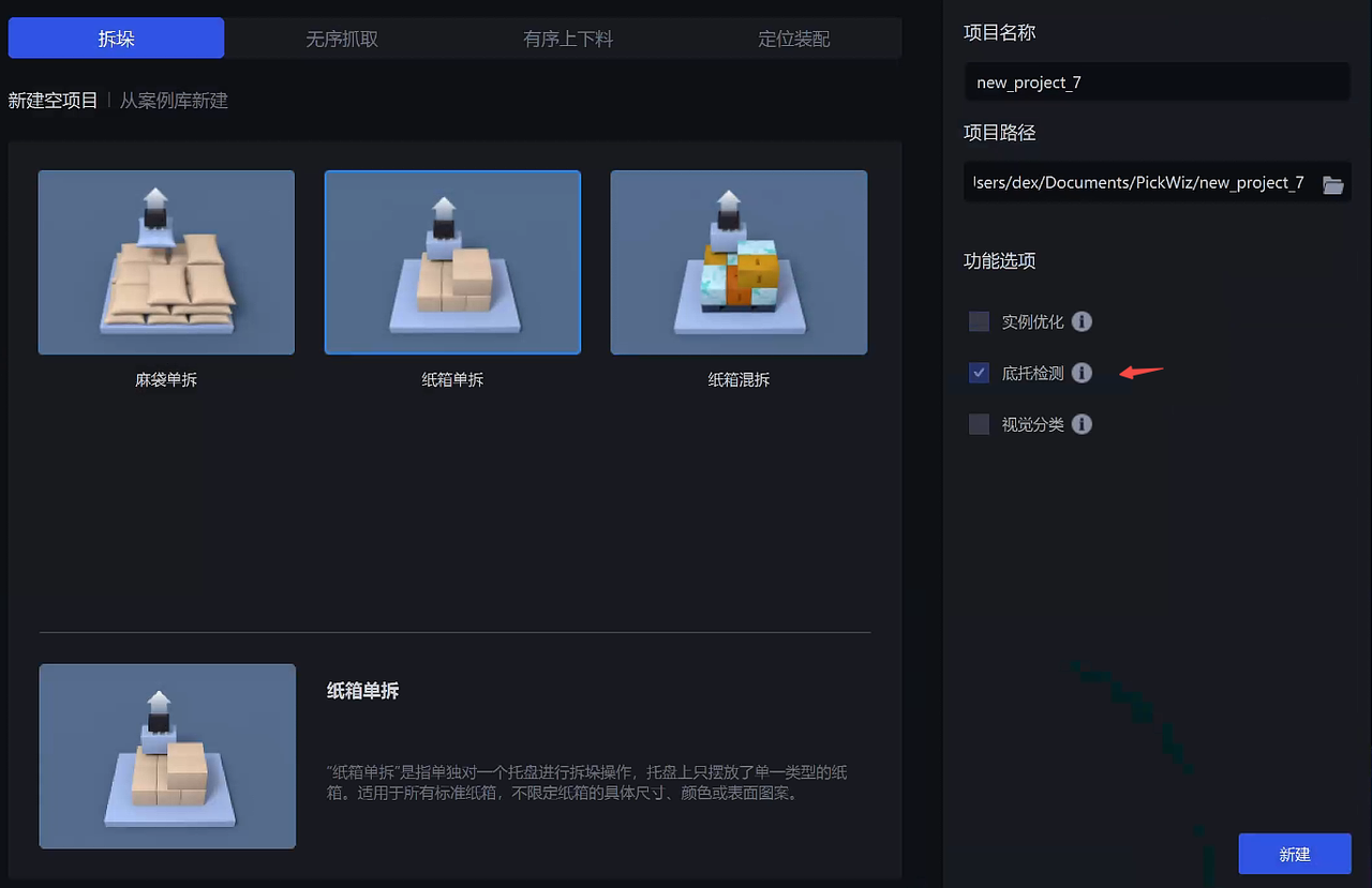 - 当实际场景中有底托,在新建项目时,勾选底托检测功能;若新建项目时未勾选,则在作业信息界面,点击右下方编辑,然后勾选底托检测