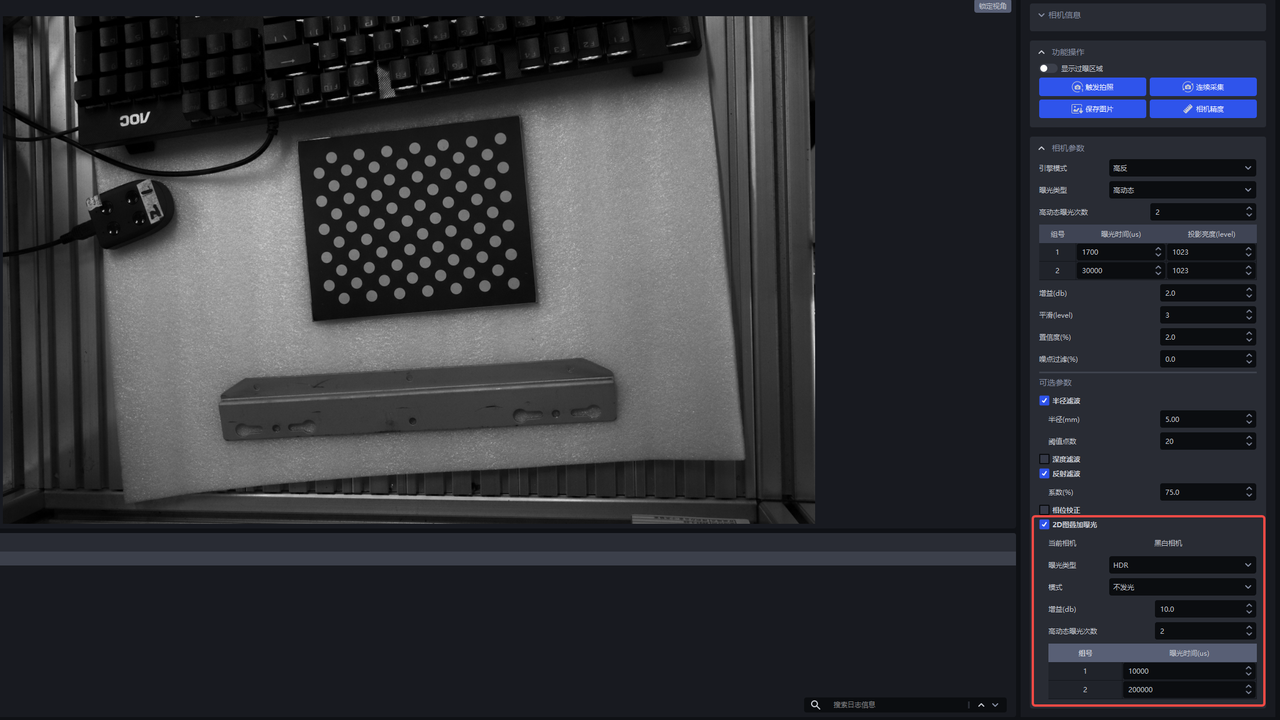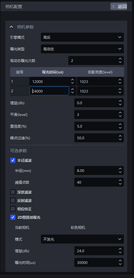 - 相机默认配置不可更改,若所有默认配置拍摄的2D图都无法达到曝光正常,可点击
