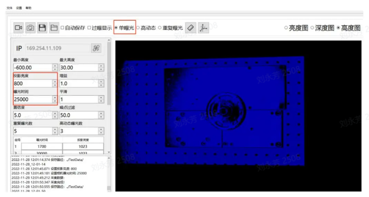 第三步:投影亮度设置个第一步和第二步的中间值为 800,曝光时间为 25000,(置信度为 5,噪点过滤为 50)可作为一组高动态下的曝光数据,不打开高动态情况下在高度图中,如下图所示。