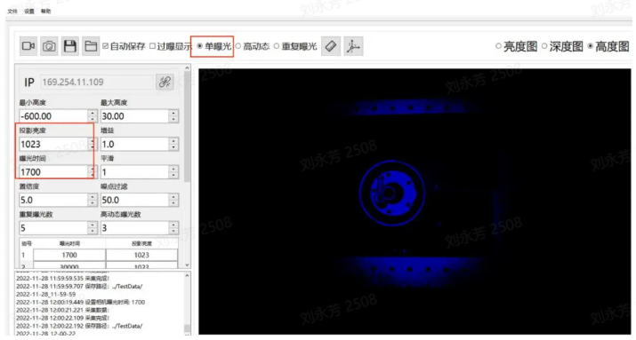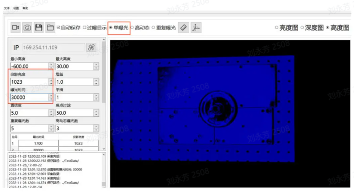 这时可增加重复曝光数量,增加有效信息,例如设置为 6,如果亮度图此时稍暗,可适当增加曝光时间,如这里从 20000 增加到 22000,再增加将会过曝,应注意!