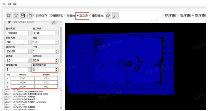 第四步:开启高动态,曝光数设置为 3,第一组数据:1700,1023;第二组数据:30000,1023;第三组数据:25000,800。置信度 5,噪点过滤 50。