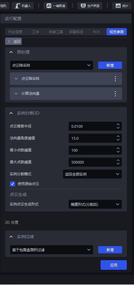 | 选择坐标系 | 在选择的坐标系下滤除点云 | ROI坐标系 | 相机坐标系;ROI坐标系;物体自身坐标系 | / | / |