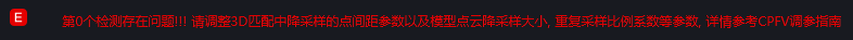 - 如日志报错"请调整3D匹配中降采样的点间距参数以及模型点云降采样大小、重复采样比例系数等参数, 详情参考CPFV调参指南",应调大重复采样比例系数,一般建议从1开始调整,1最慢但是精匹配成功率最高,0.1最快但精匹配成功率最差。