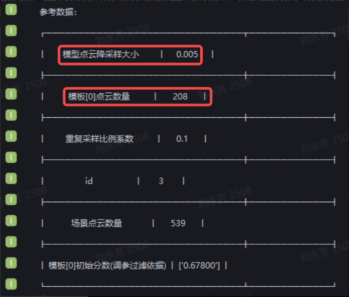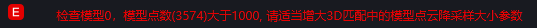 - 如日志报错"模型点数大于1000,请适当增大3D匹配中的模型点云降采样大小参数",则应当调大模型点云降采样大小,减少降采样后模板点云的点数;