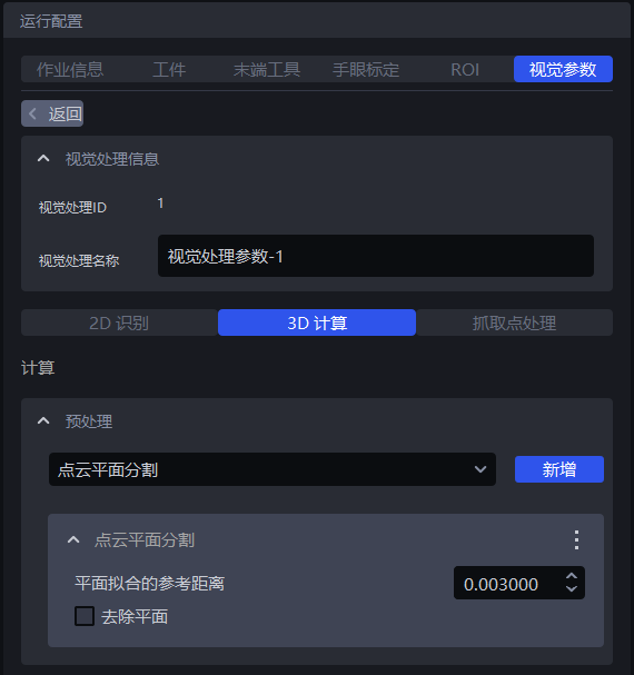 | 是否去除平面 | 勾选则去除点云数量最大的平面,不勾选则保留点云数量最大的平面 | 不勾选 | / | / | 如果点云数量最大的平面是工件,则保留平面,不勾选;如果点云数量最大的平面是噪声,则去除平面,应勾选 |